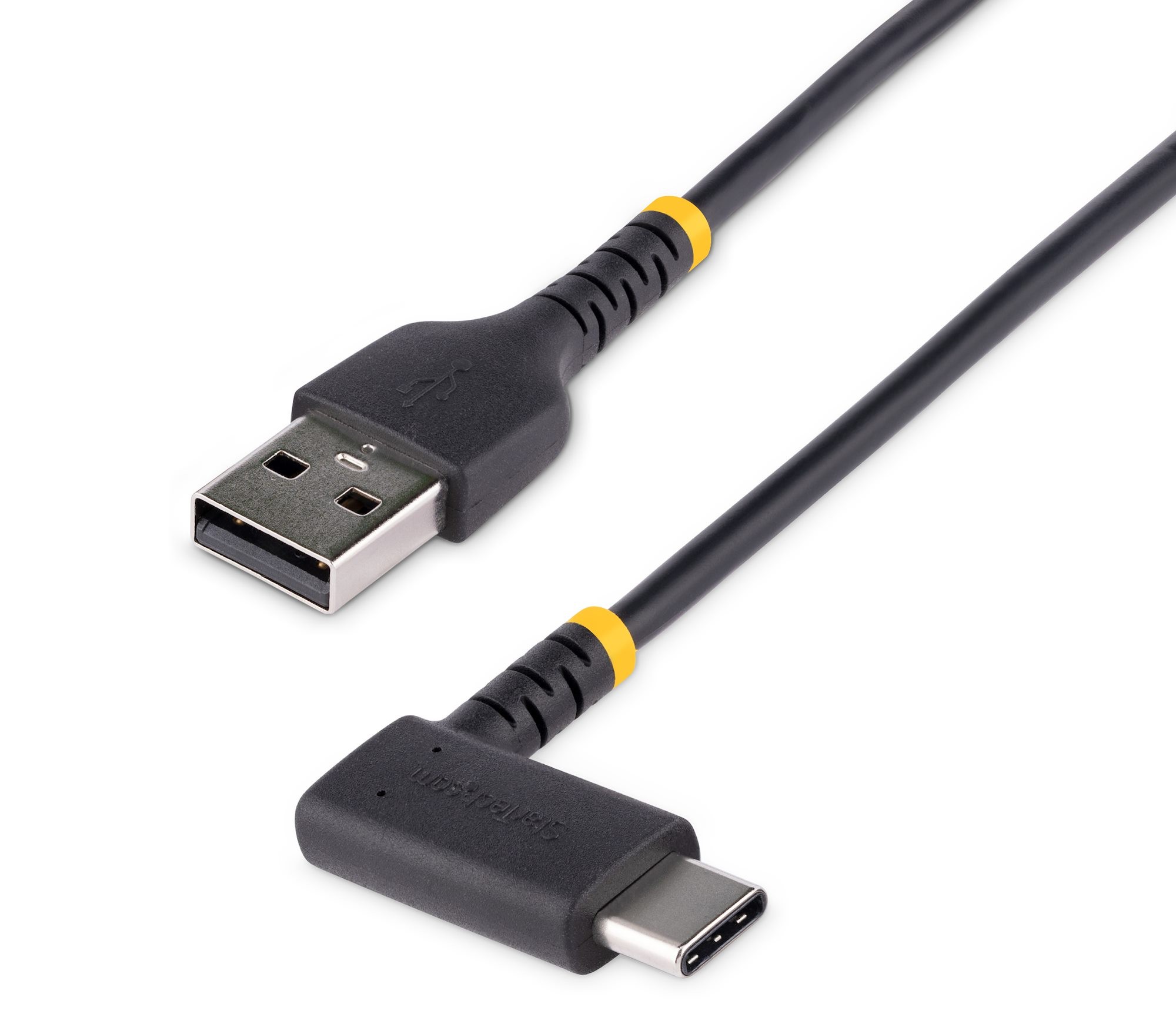 This rugged 3ft (1m) USB-A to right angle USB-C cable can be used to connect and/or charge a USB peripheral. Conveniently connect USB-C enabled devices at a right angle to the cable for organized cable routing solutions.
