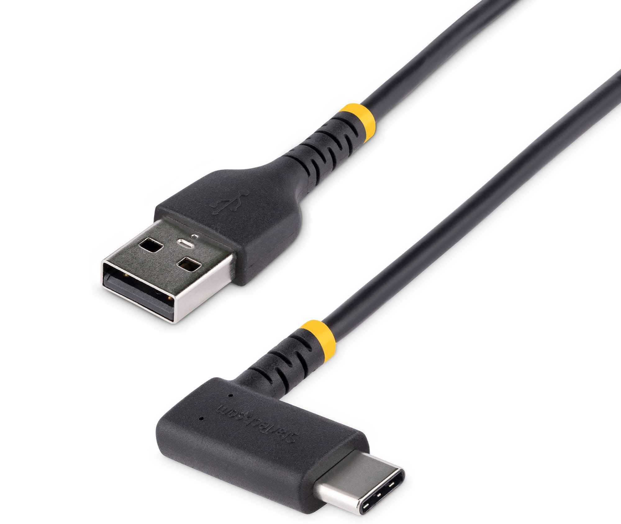 This rugged 1ft (30cm) USB-A to right angle USB-C cable can be used to connect and/or charge a USB peripheral. Conveniently connect USB-C enabled devices at a right angle to the cable for organized cable routing solutions.