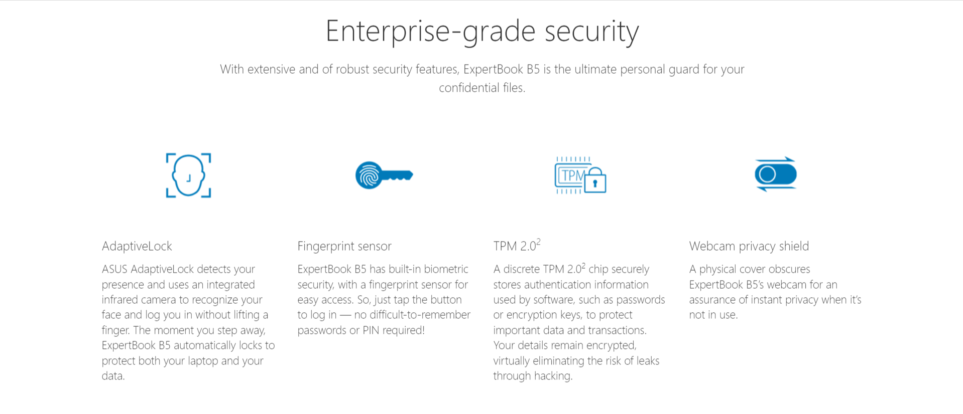 A small, bright LED light on the top cover of ExpertBook B5 offers an at-a-glance indication of your status — automatically glowing when you’re busy in a conference call. So, if you’re headlong into a Skype or Teams meeting, your colleagues will know instantly to not bother you at that moment!