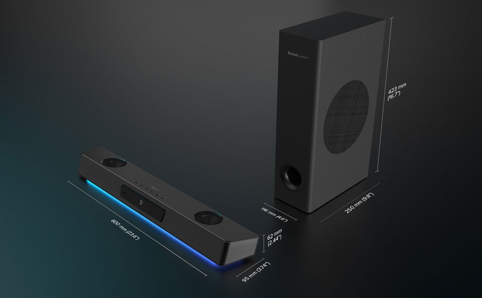 Connection is seamless too with USB audio, convenient HDMI ARC, Bluetooth 5.0 technology for wireless audio streaming, optical-in, SXFI-out, and a 3.5 mm AUX-in for analog audio. The soundbar also comes with dual built-in beamforming microphones if you want to quickly hop onto a chatroom on Discord with your team, or even for your online meetings.