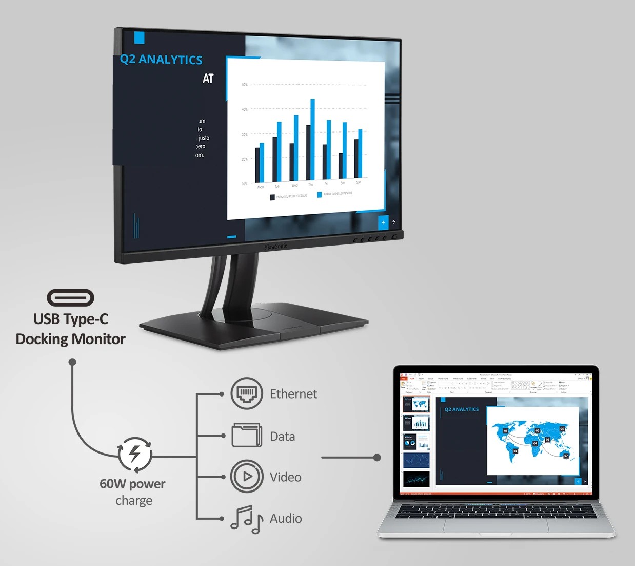 As a single cable solution, USB-C connectivity reduces the reliance on multiple wires, cables, and adapters. In addition to fast data, audio, and video transfer, USB-C also provides quick 60W charging over a single cable.