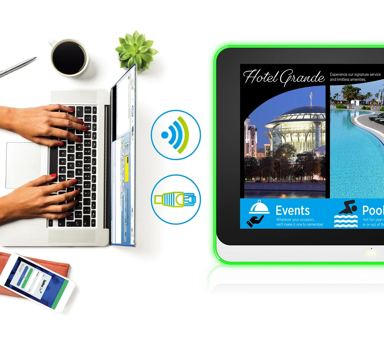 This display utilizes state-of-the-art Power over Ethernet (PoE) technology for one-wire installation. This allows you to easily power and connect your displays with just a single cable. PoE also allows you to create multi-display digital signage installations, while reducing installation costs.