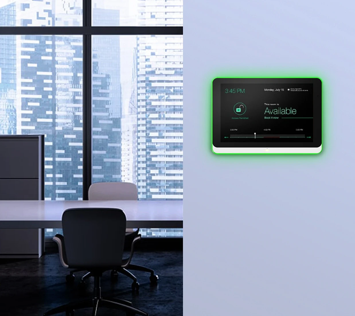 With a sleek brushed metal finish, built-in cable management and single-wire installation, delivers a sleek and modern design. An integrated halo light helps teams rapidly locate available meeting spaces at a glance while creating a vibrant mood in the workplace.