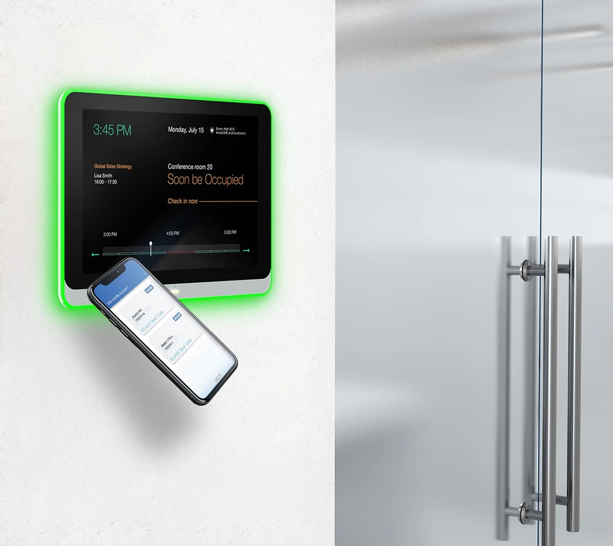 Physical access control enables facilities managers to regulate entry to meeting spaces to avoid accidental interruptions, and to restrict access to invited attendees only. Employees can easily reserve, release, check in, and check out of meeting spaces with their NFC or HID enabled company-issued badge, QR code, or HID mobile access app.
