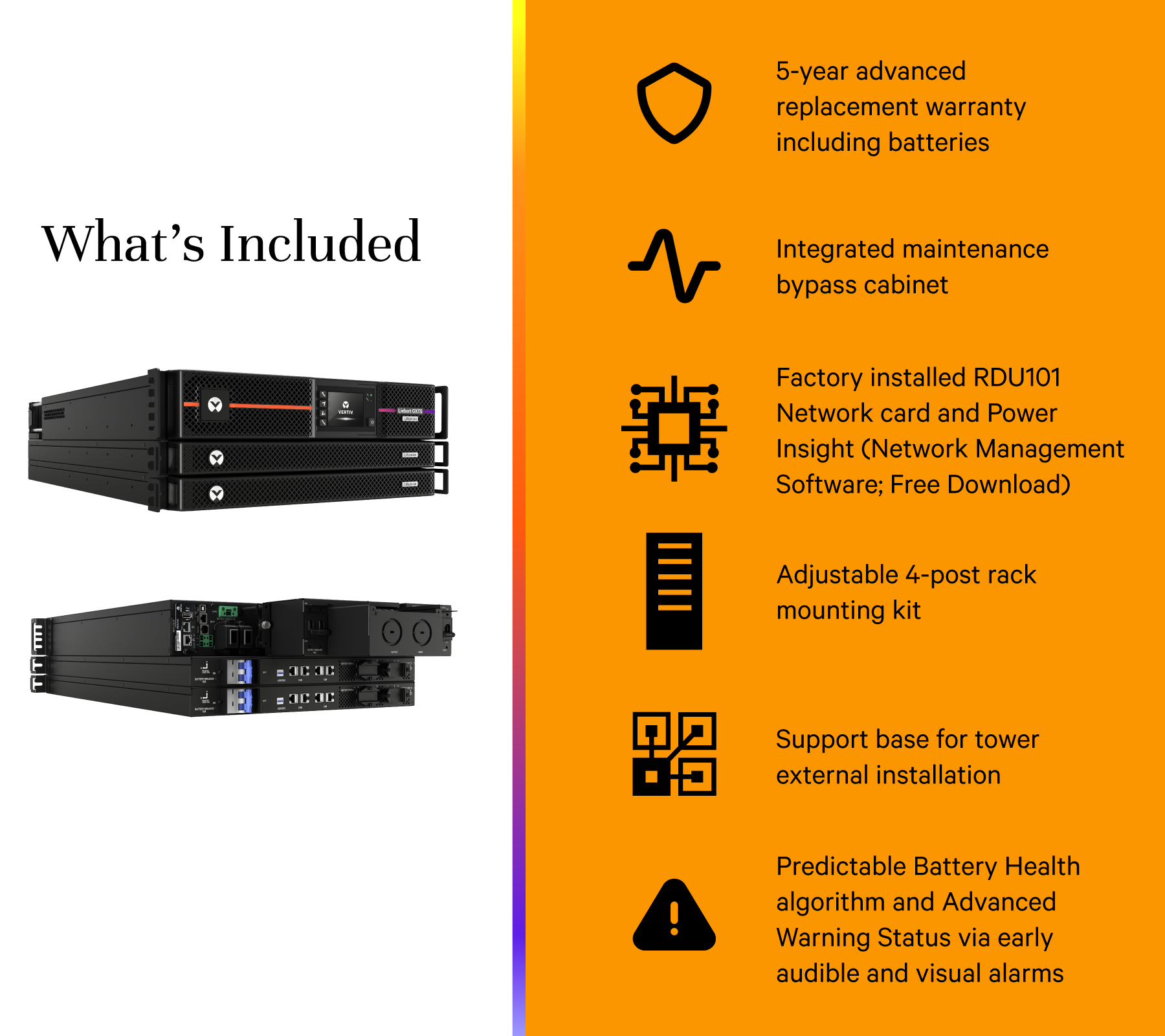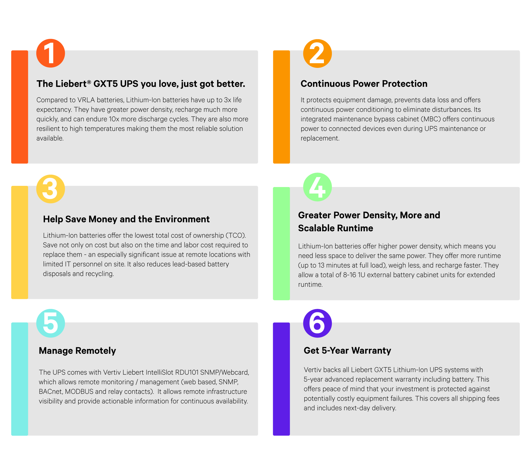 The Vertiv Liebert GXT5 Lithium-Ion UPS offers complete protection for the unique requirements of centrally managed IT assets in edge locations with limited trained IT/Infrastructure resources on-site. Where IT downtime can disrupt business and on-site personnel are unprepared to deal with service issues, this UPS delivers reliable and worry-free power protection. Its online double-conversion technology makes this it an ideal solution for network closets, server racks, customer tracking and security systems, and other critical equipment at the edge.