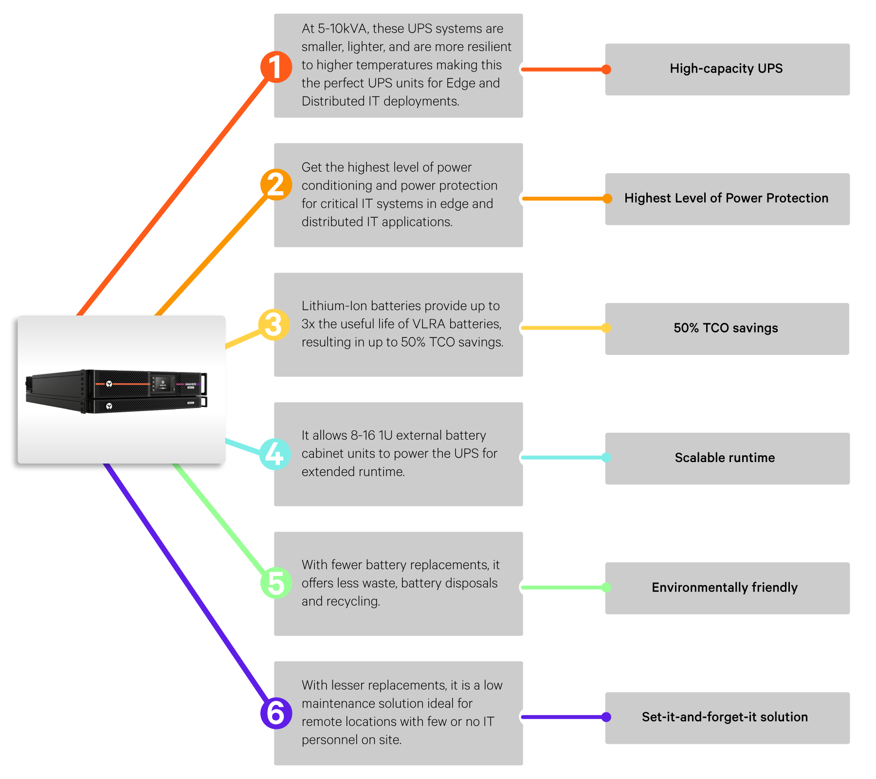With the Internet of Things (IoT) and the rollout of 5G networks, we see more companies drive towards simpler, smarter, more self-sufficient, powerful and low-latency edge of the network computing closer to the end-user. The Vertiv Liebert GXT5 Lithium-Ion online UPS provides the reliability and manageability needed for servers, network communications, switches, hubs, telecommunications equipment, and routing devices needed to support applications such as VoIP and IP Telephony or other critical call center applications.
