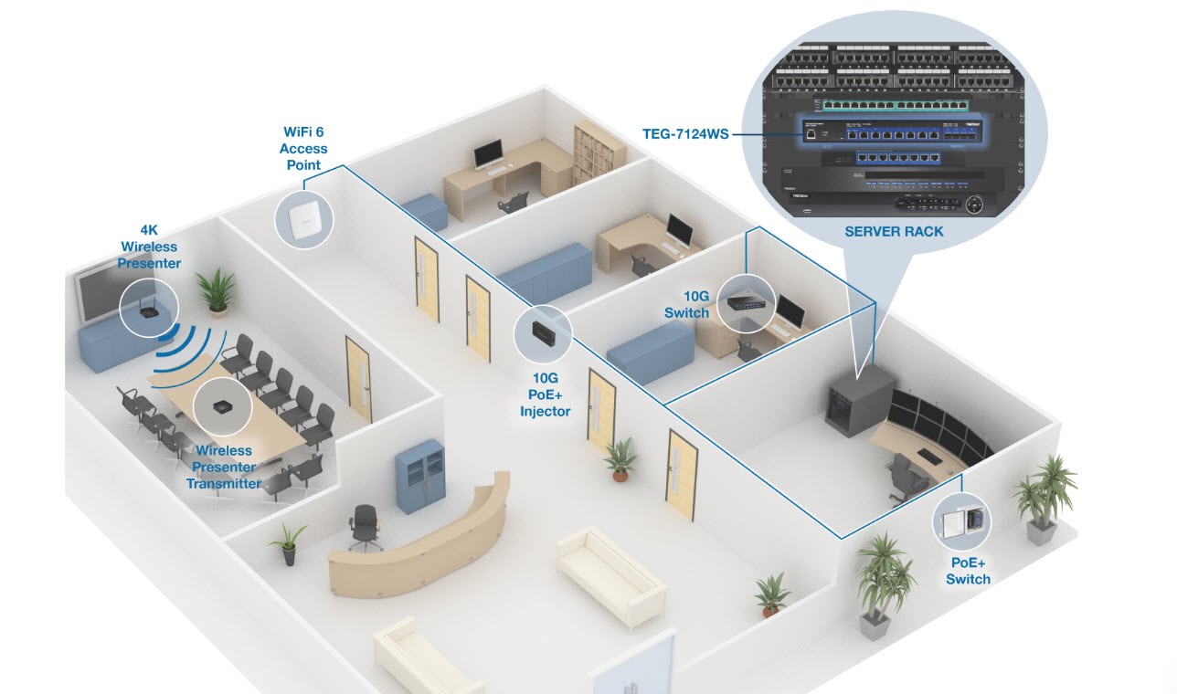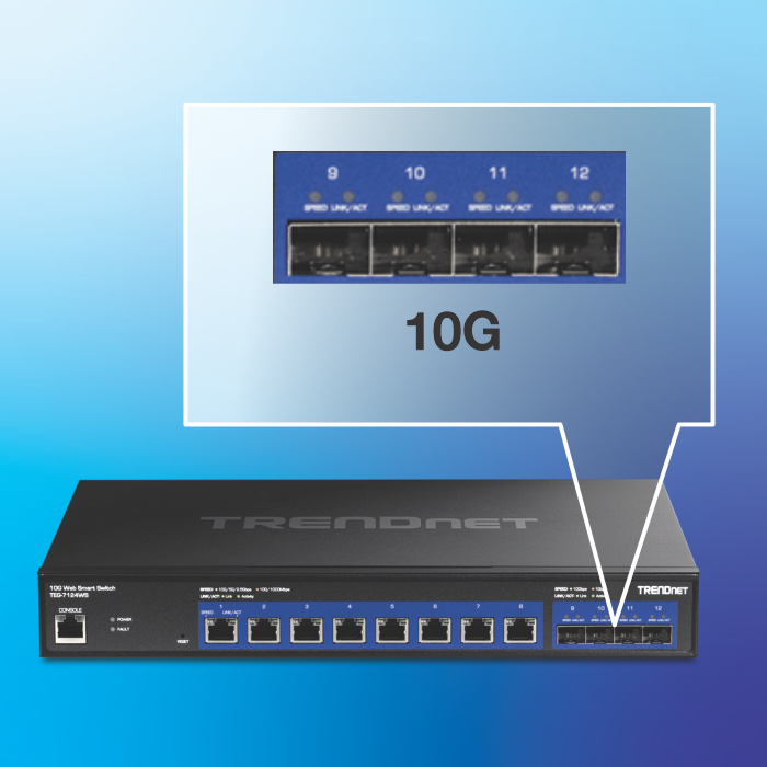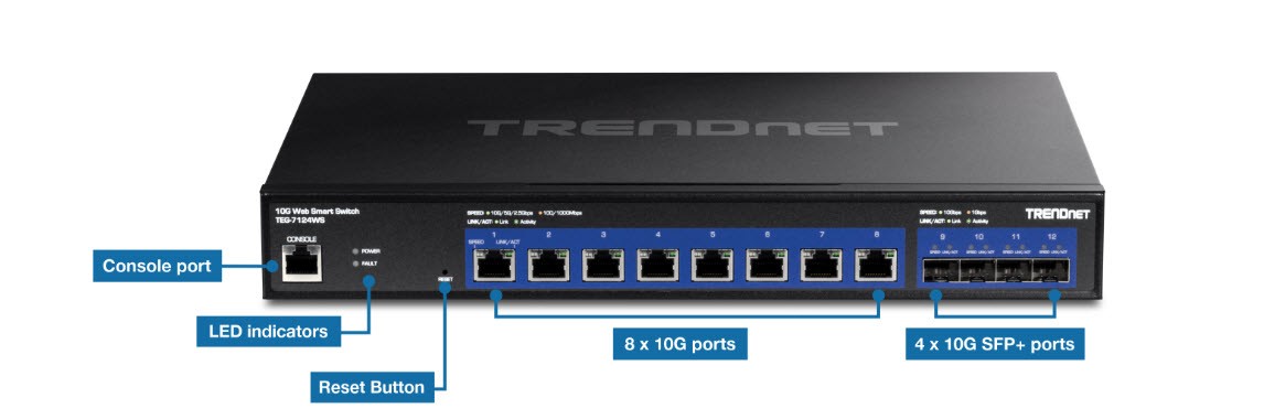 This 12-Port 10G managed switch also features eight 10GBASE-T Ethernet ports, and four 10G SFP+ ports for long-distance, high-speed fiber network connections, providing a cost-effective solution in adding 10G link capability to an SMB network.