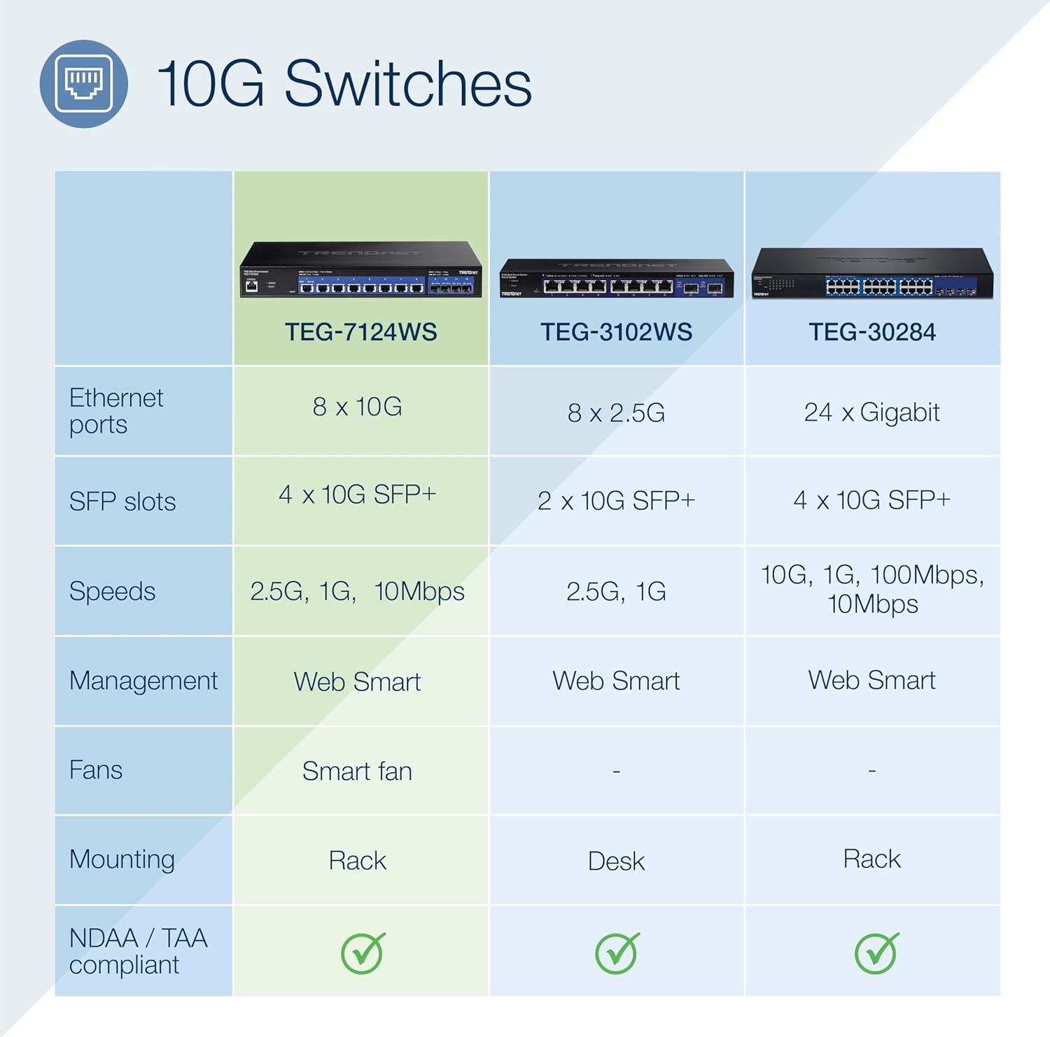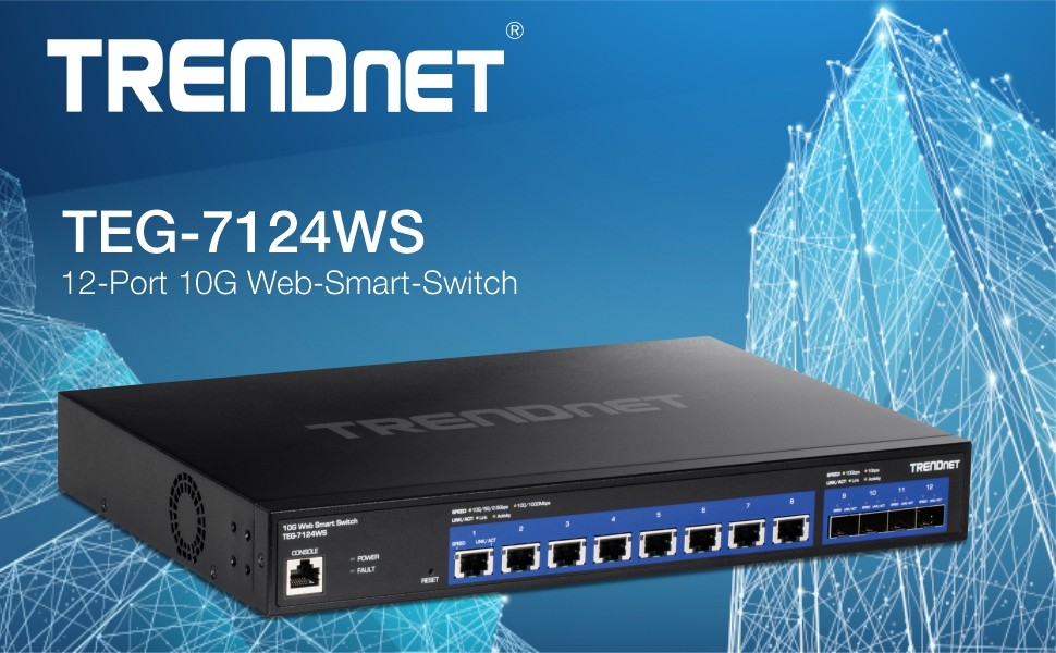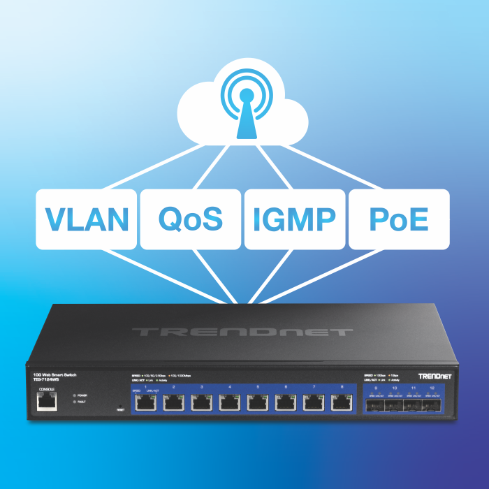 TRENDnet’s 12-Port 10G Web Smart Switch, model TEG-7124WS, offers advanced traffic management controls to meet the evolving demands of SMB networks. This rack mountable IPv6-ready 10Gb managed switch comes with an easy-to-use, intuitive web-based interface. Management features include LACP to increase bandwidth between switches, VLANs for segmenting and isolating virtual LAN groups, QoS for traffic prioritization, port bandwidth controls, and SNMP monitoring, making this a powerful solution for any SMB network. Improve voice performance by isolating and prioritizing VoIP traffic from normal data traffic with an easy-to-use voice VLAN feature.