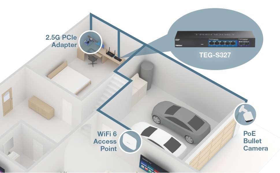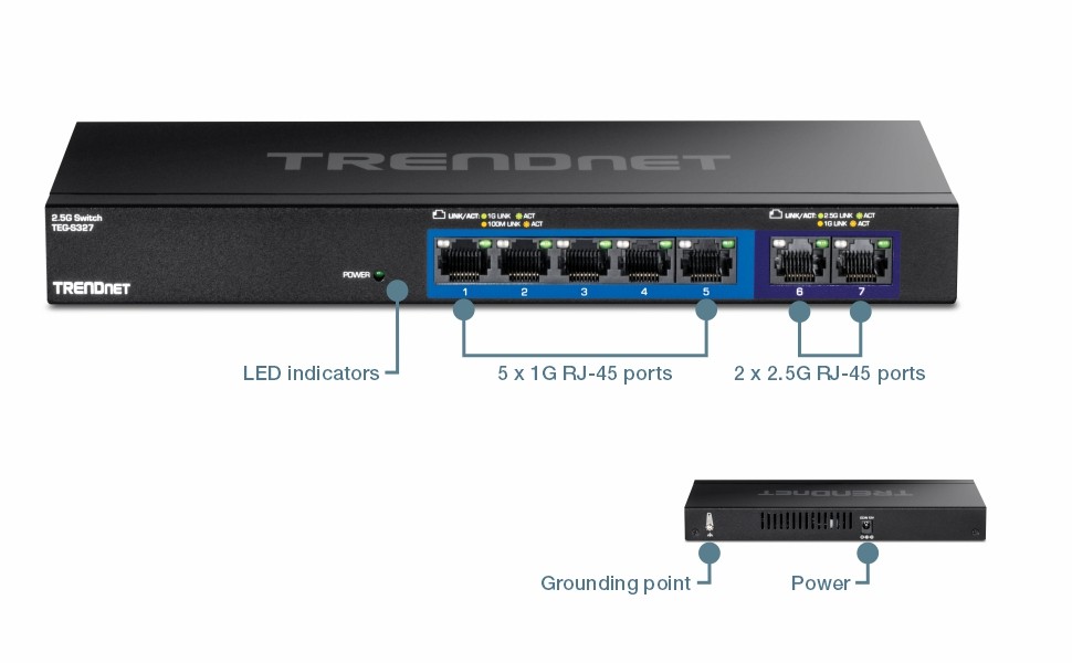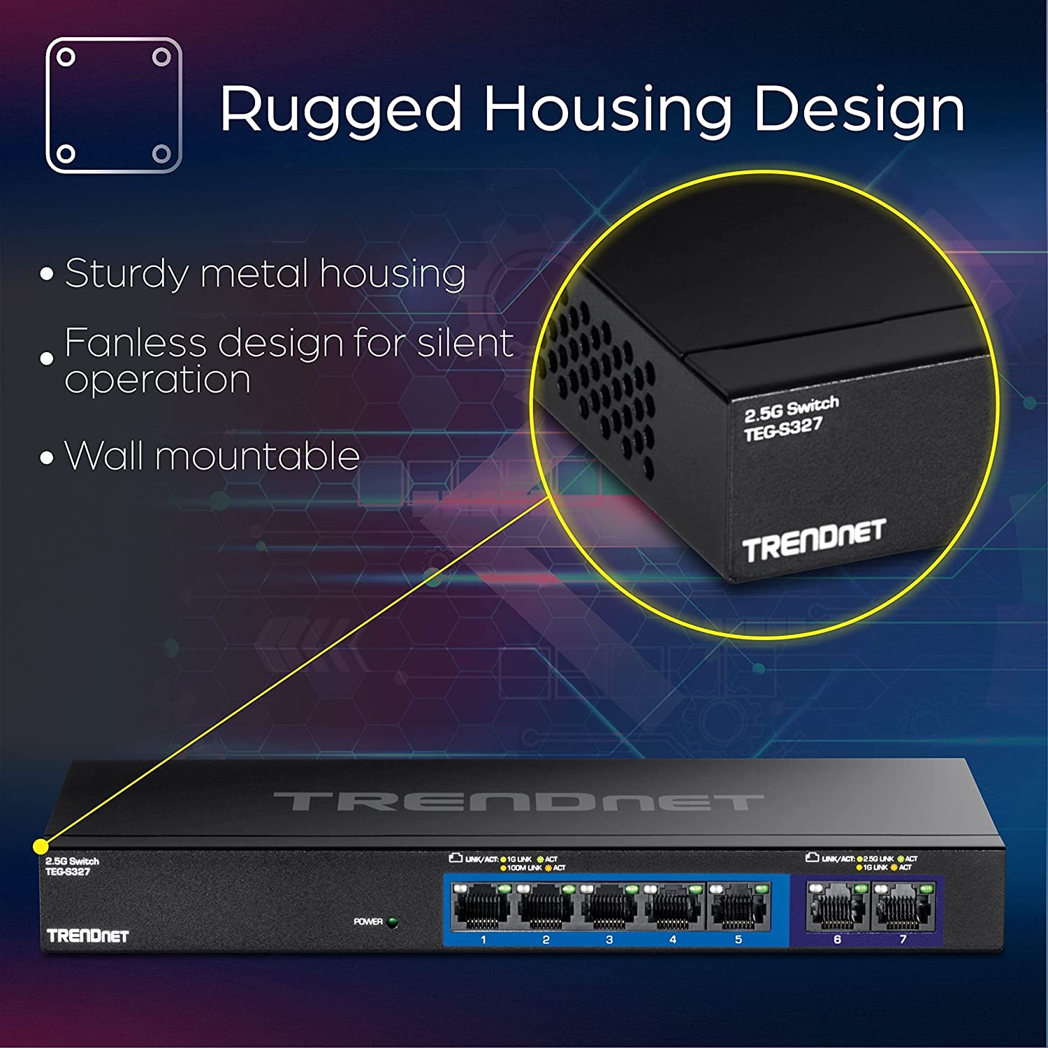 TRENDnet’s 7-Port Multi-Gig Switches, model TEG-S327 and TPE-TG327, is an affordable 2.5G switch that provides advanced high-bandwidth performance, ease of use, and reliability. The multi-gig switches offers two dedicated 2.5G ports and five dedicated 1G ports for high-speed network connections with a 20Gbps switching capacity. Having a sturdy compact metal housing and fanless design, the multi-gig switch is a cost-effective solution for high-speed network connections.