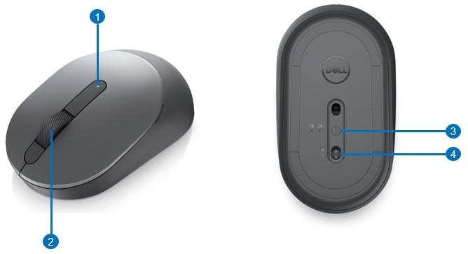 1. Battery status indicator | 2. Scroll wheel | 3. Toggle button | 4. On/off switch