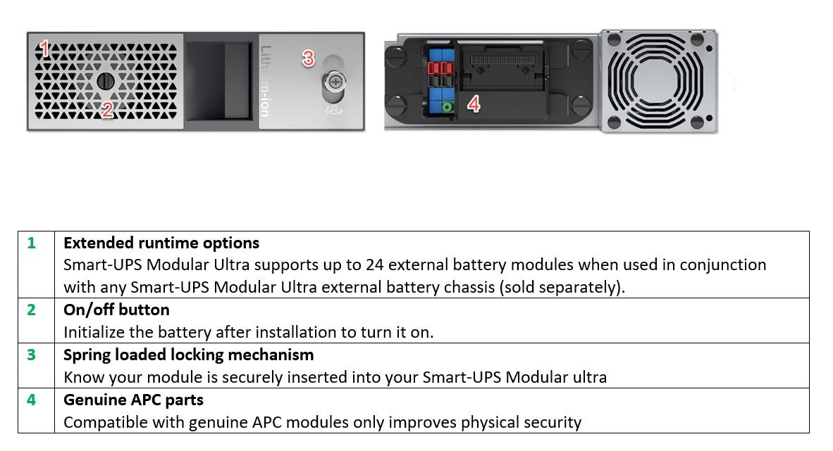 When you need extended runtime Smart-UPS Modular Ultra delivers. Up to 5 Smart-UPS Modular Ultra bays can be populated with battery modules with one power module installed (SRYL5KPMT). The external battery chassis (SRYLFXBPRM4) hold 4 battery modules each. Smart-UPS Modular Ultra currently supports 6 external battery chassis for extended runtime support of 24 battery modules.