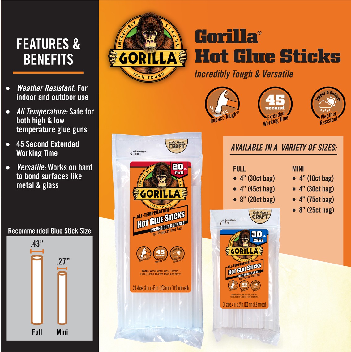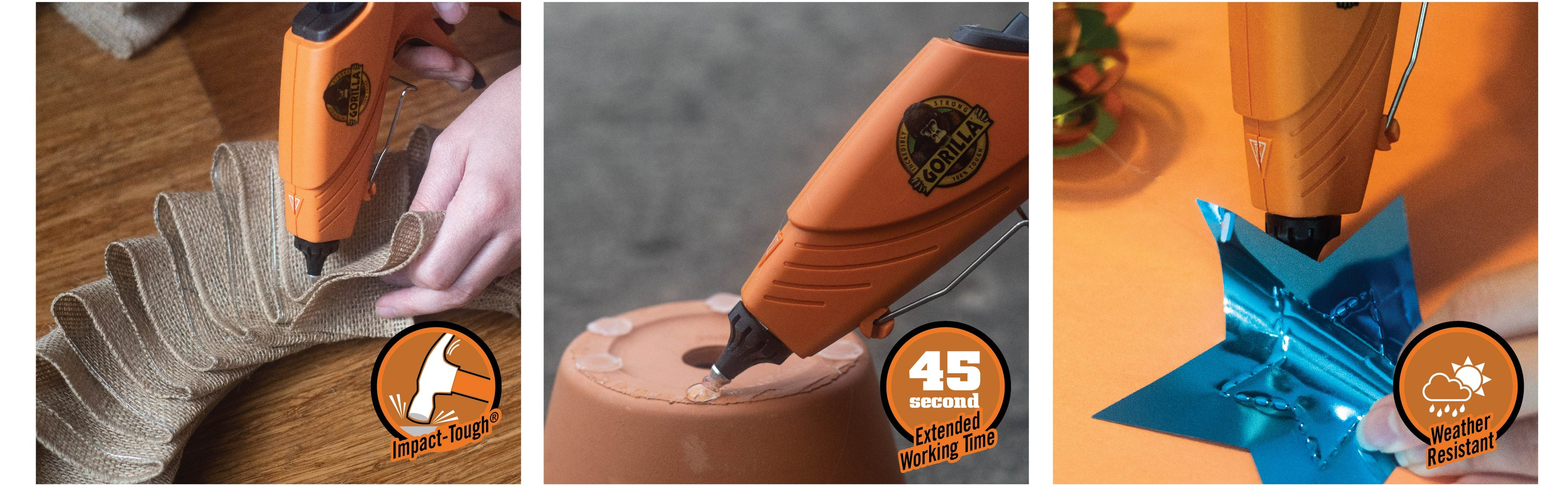 The Gorilla Dual Temp Mini Glue Gun is an ideal tool for crafts and repairs. It is light weight, with a comfort grip and a built-in stand making it easy to use. The easy squeeze trigger and long insulated nozzle allow a precise application on whatever project you are working on.