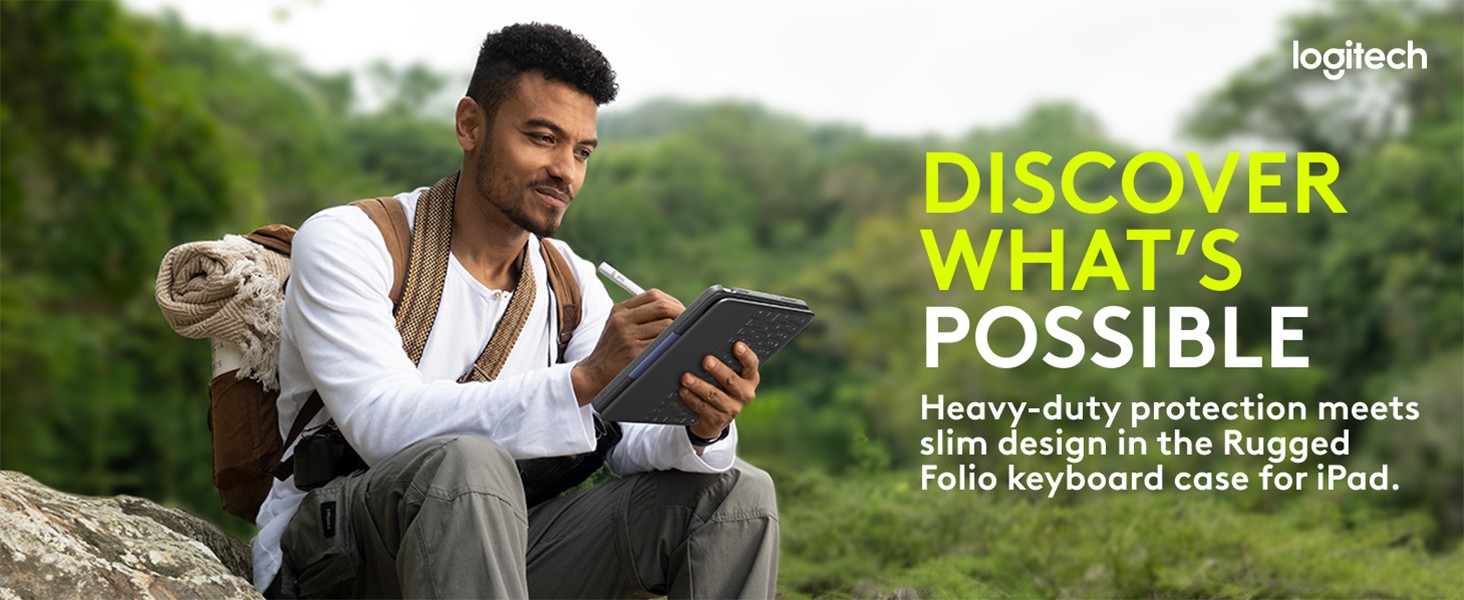Rugged Folio for iPad is a slim keyboard case with drop protection that exceeds military standard tests. Enjoy a full-size keyboard with convenient iPadOS® shortcut keys, secure form-fit protection for your iPad, and a handy spot to stow Logitech Crayon or Apple Pencil. Plus, high performance spill and dirt-resistant sealed keys make this the perfect tool for on-the-go work