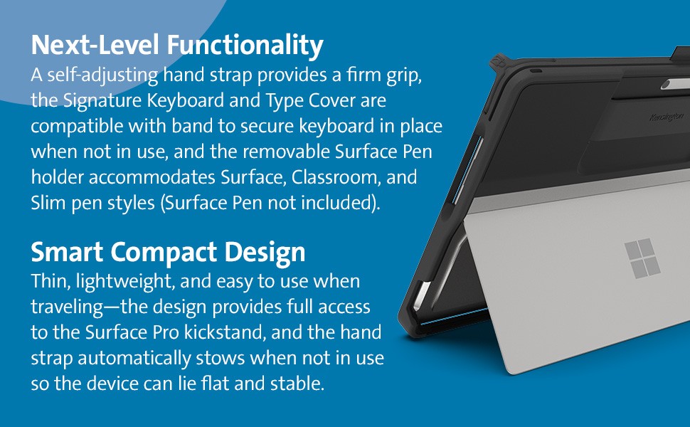 Designed exclusively for Surface Pro, the BlackBelt Rugged Case for Surface Pro 9 is the ultimate case for protecting your Surface Pro—delivering military-grade protection tough enough to withstand the rigors of harsh work environments, and next-level professional features for productivity, security, and privacy. Ready for anything, the BlackBelt Rugged Case provides a compact design with all port access, heat dissipation channels, a self-adjusting hand strap that allows the device to lie flat, the Signature Keyboard and Type Cover are compatible with band to secure keyboard in place when not in use, a removable Surface Pen holder (Surface Pen not included), full access to the Surface Pro kickstand, and cable lock and privacy screen compatibility.