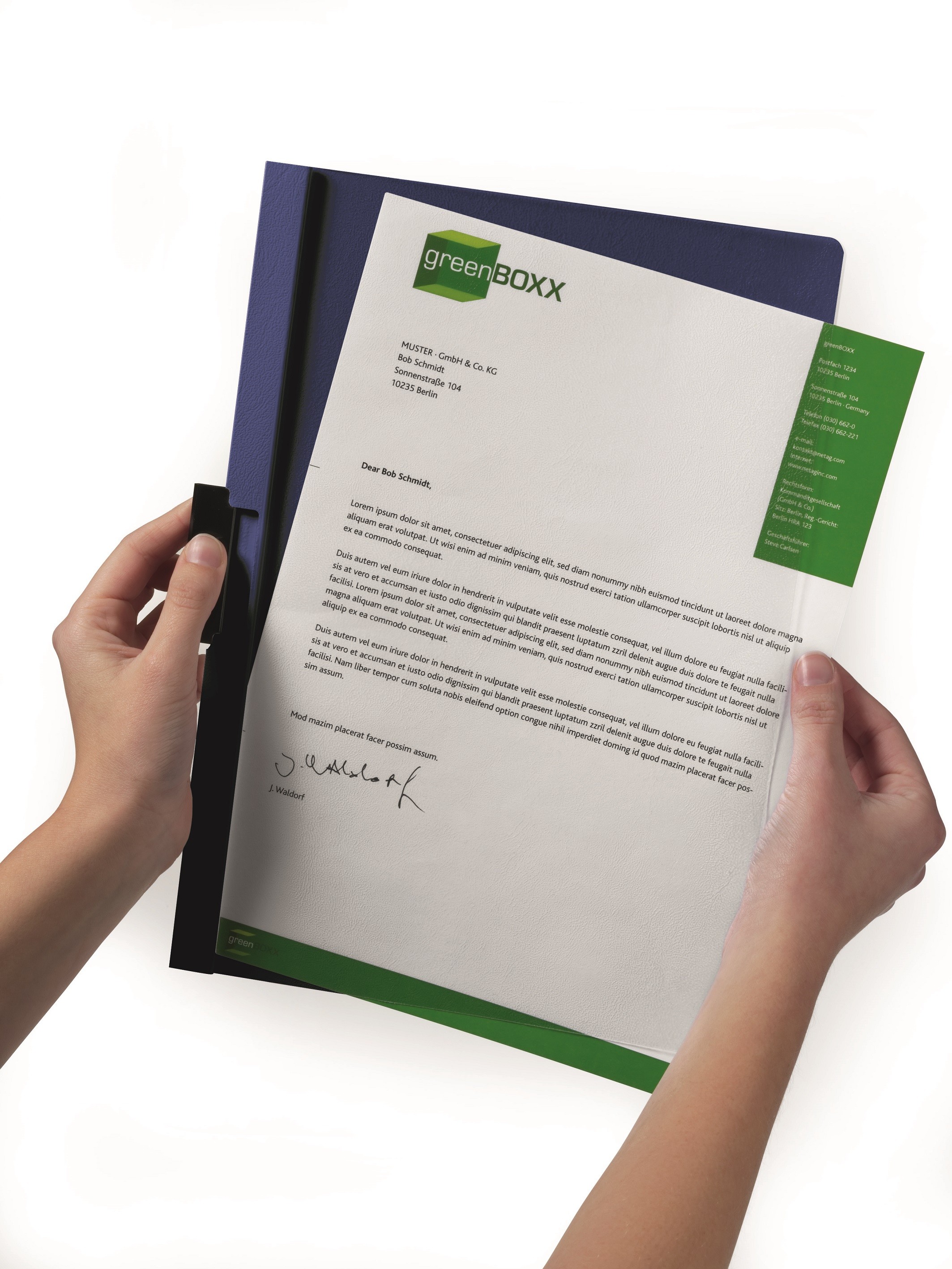 The DURACLIP is the original punch-free report cover since 1959, developed by Durable, and still made in its German facilities. A strong "memory" clip expands to hold contents securely and returns to its original shape after use. The clip has a five-year guarantee. Each report cover is made of sturdy vinyl with clear front to show-off contents while protecting them from the elements and accidents. With a 30-sheet capacity for 11 x 8.5 inch (letter size) sheets, each DURACLIP Report cover has a colored back and spine with a clear front cover. Durable is an office supplies manufacturer that has risen to the highest ranks among German brands and is celebrating more than 90 years in operation. At Durable, we believe in taking responsibility for our choices and fostering stewardship. Durable products are good because of their durability. Our high quality standards enable us to produce outstanding consumer items that are built to last, thus requiring less frequent replacement. At Durable, we continue to seek ways to offer consumers the highest quality products, and, at the same time protect and preserve the future of Mother Earth.