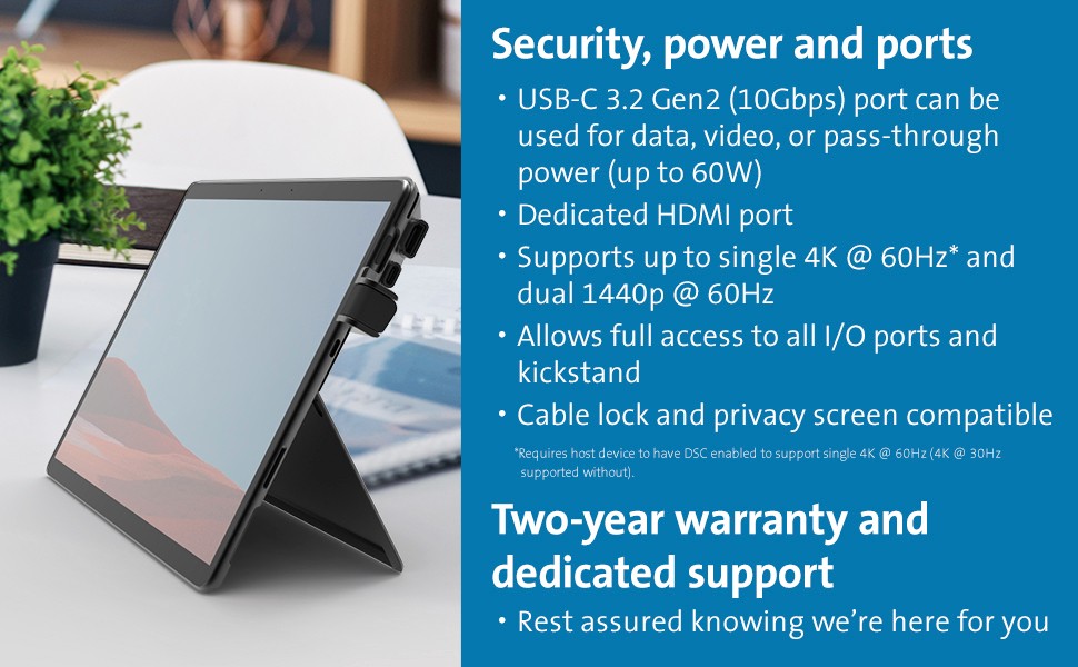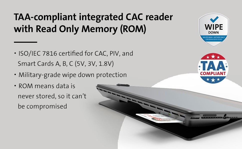 CAC reader, military-grade wipe down protection, power pass-through (up to 60W), a kickstand opening, cable lock compatibility, and privacy screen