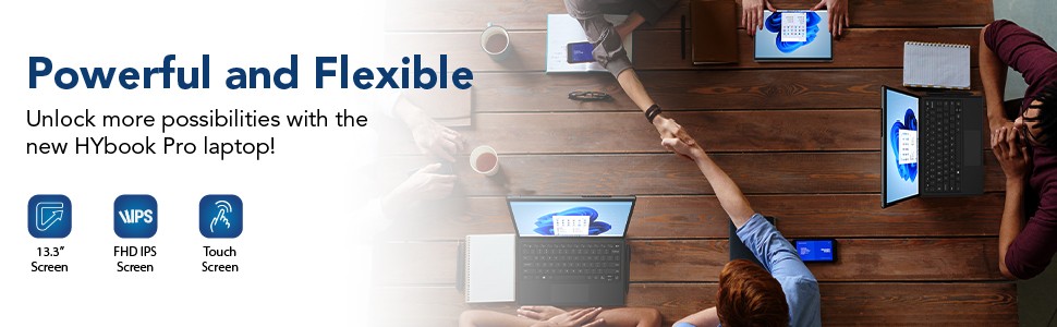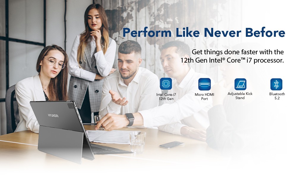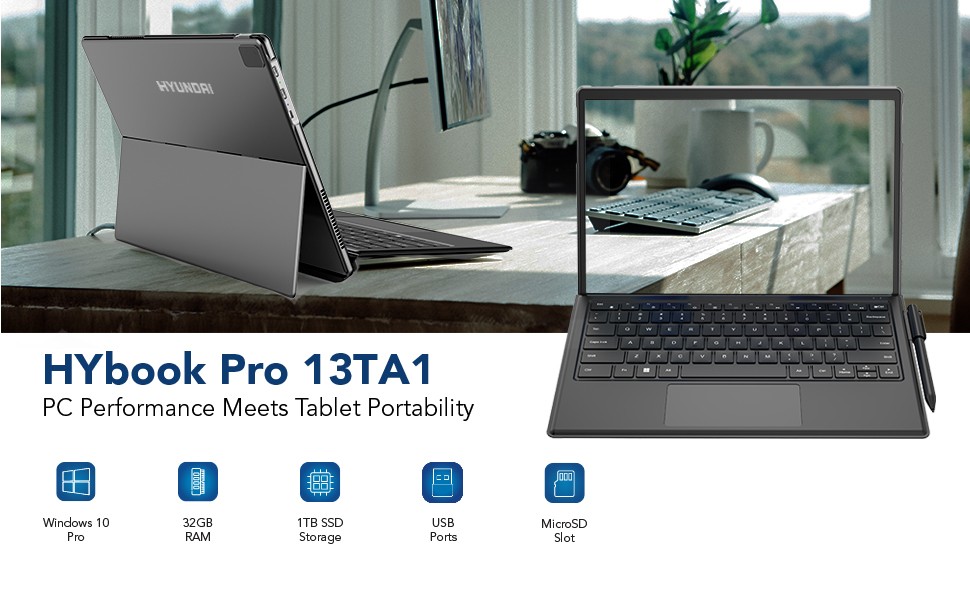 Unlock more possibilities than ever with the HYbook Pro laptop designed for a Pro like you. Hyundai Technology's first consumer laptop-to-tablet PC designed with Intel and designed to light up the best of Windows 10 Pro. The 2-in-1 PC combines the power of a laptop with the flexibility of a tablet, and every angle in between, with the iconic kickstand and detachable keyboard and stylus pen. Do great things with a larger 13.3” full HD touchscreen, 1TB of storage, AX WiFi connectivity and extra speed when you need it.