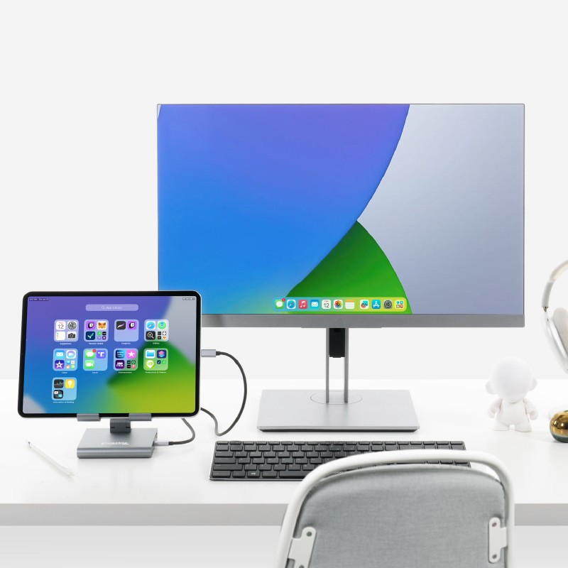 The Little Screen Becomes the Big Screen The Plugable USB-C Docking Station with Tablet Stand or Phone Stand (UDS-7IN1) adds functionality to your Windows tablet, M1 or M2 iPad Air or iPad Pro and USB-C phones and tablets that support DisplayPort Alt Mode, like the Samsung Galaxy devices. Let’s start with your screen, when it comes time to get actual work done, the pinch and zoom will only get you so far. Extend to a bigger screen with a 4K 30Hz capable HDMI port. It’s like going from fun-sized to full-sized. Note: supports 1600x900, 1920x1080, and 2560x1440 resolutions only