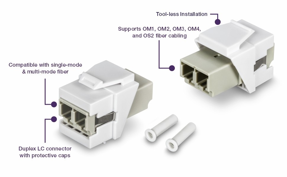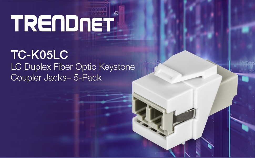 TRENDnet’s LC Duplex Fiber Optic Keystone Coupler Jacks – 5-Pack, model TC-K05LC, includes five LC duplex fiber keystone jacks for use with TRENDnet’s TC-KP24SA blank shielded keystone patch panel. These fiber keystone jacks are designed for gigabit and 10G fiber optic network applications. Each fiber keystone jack is designed for use with single-mode or multi-mode fiber cabling. The LC fiber female-to-female coupler design makes it easy and simple to join two fiber patch cables together. These LC duplex fiber coupler jacks feature a convenient tool-less snap-in design for easy installation.