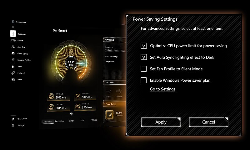 The Power Saving function contains several settings that can easily optimize power consumption and maximize energy savings. You can enable a CPU power limit, darken Aura lighting, and set the fan profile to a power saving mode. You can also toggle the Power Saver plan that is built into Microsoft Windows.
