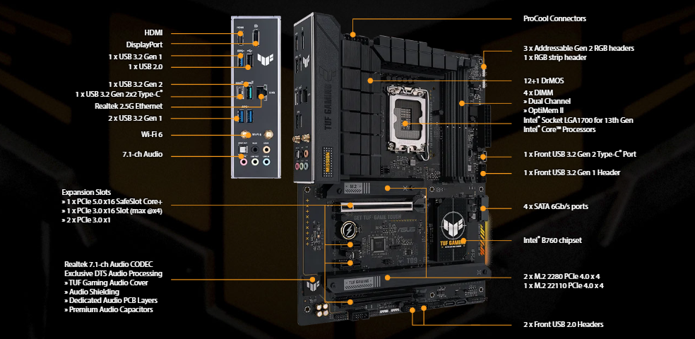The TUF GAMING B760-PLUS WIFI D4 reaches new heights of performance potential with the latest version of PCI Express, while an arsenal of USB ports includes two Type-C connections, and Thunderbolt 4 expands compatibility and bandwidth even further.