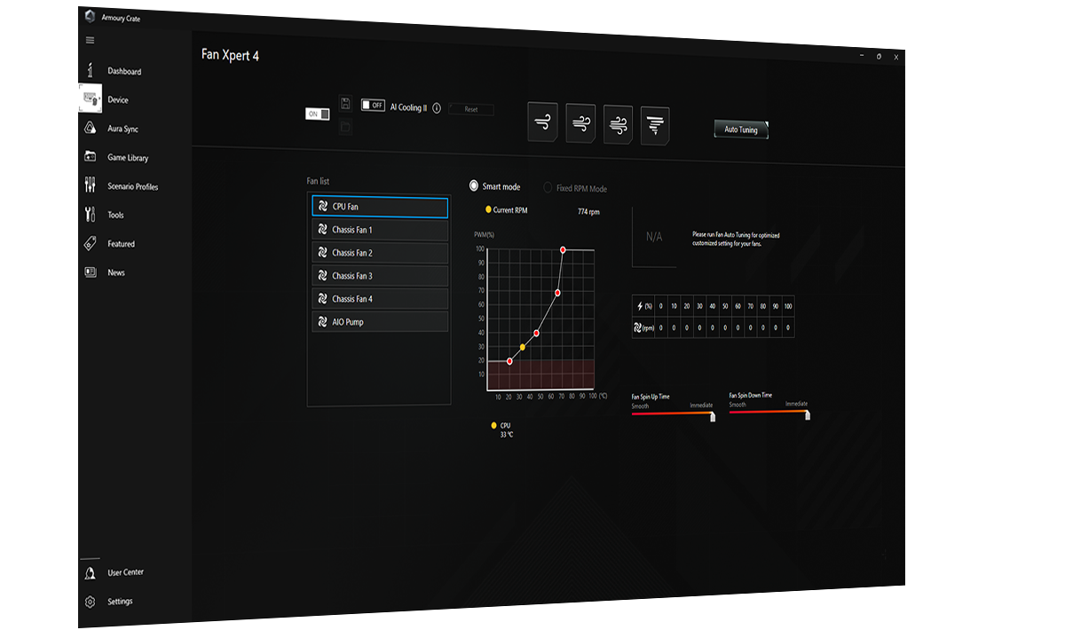 ASUS Intelligent Control makes your PC smart. Along with taking care of complex tuning and dynamically optimizing essential aspects of your system, it offers intelligently simplified options for newcomers to PC DIY, as well as more comprehensive features for seasoned veterans.