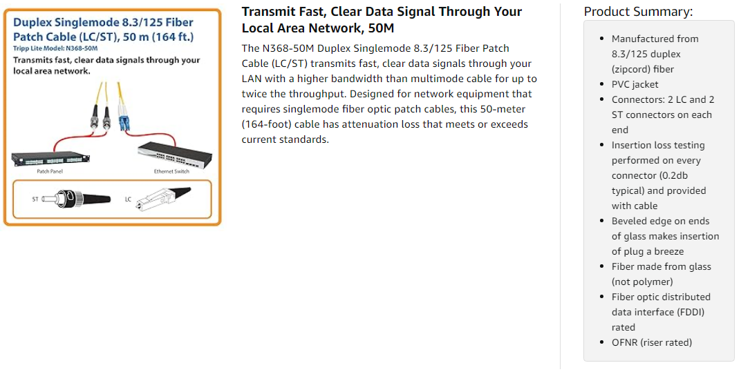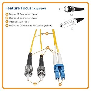 The N368-50M has 8.3/125 duplex (zipcord) fiber made from glass, instead of polymer. The sturdy LC and ST male connectors meet stringent insertion loss standards and feature beveled edges on their glass ends for easy insertion into a patch panel or switch. The FDDI- and OFNR-rated PVC jacket is yellow to easily identify it as a singlemode cable.