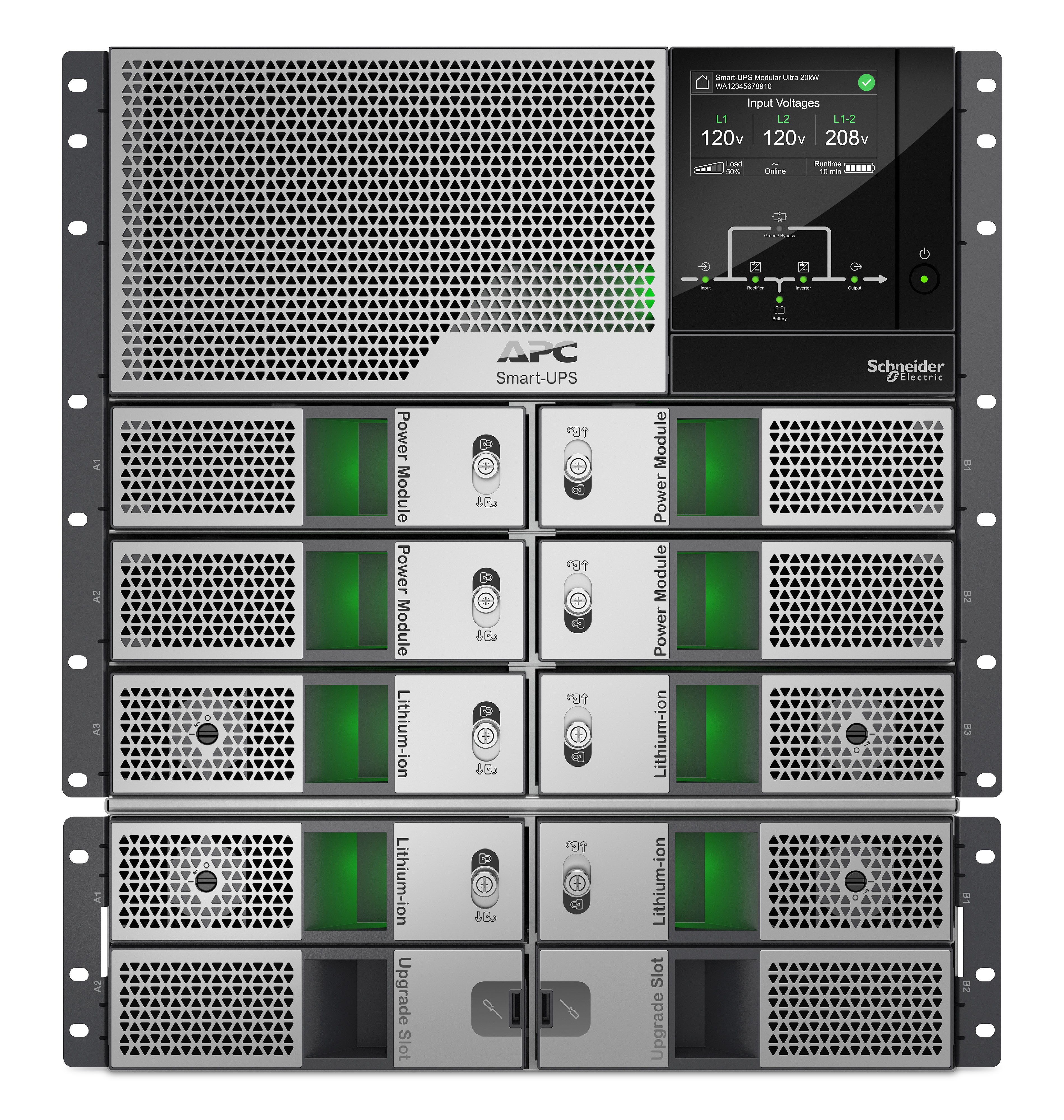 The APC Smart-UPS Modular Ultra 20kW configurable to 20kW N+1 with 120/208/240V split phase output. Its next generation semiconductor technology delivers up to 20kW in half the size of comparable UPSs. In addition to long lasting Lithium-ion batteries the weight is reduced by 60% in comparison to Lead Acid VRLA UPS. With the Embedded Network port you can monitor and manage your UPS anytime, anywhere.