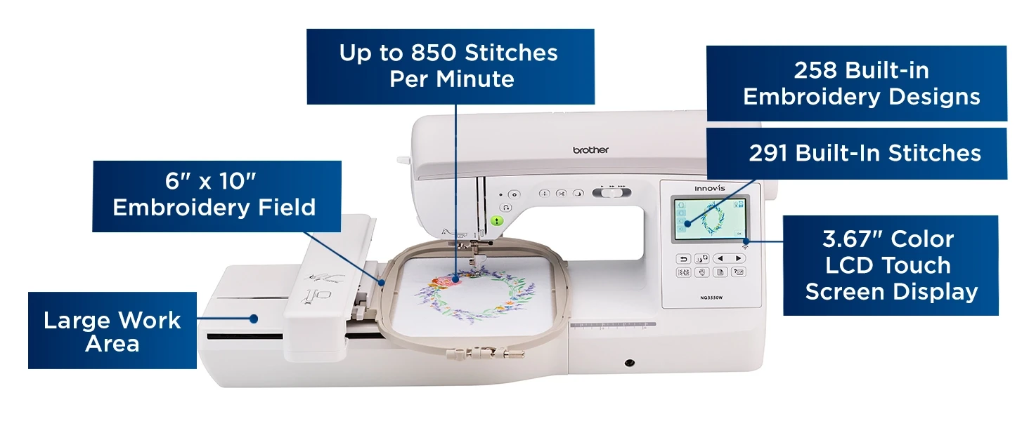 When connected to your wireless network, using Design Database Transfer 1 , send custom designs from your PC to the NQ3550W (no USB required) and then embroider and sew designs at up to 850 stitches per minute so you can create more in less time.