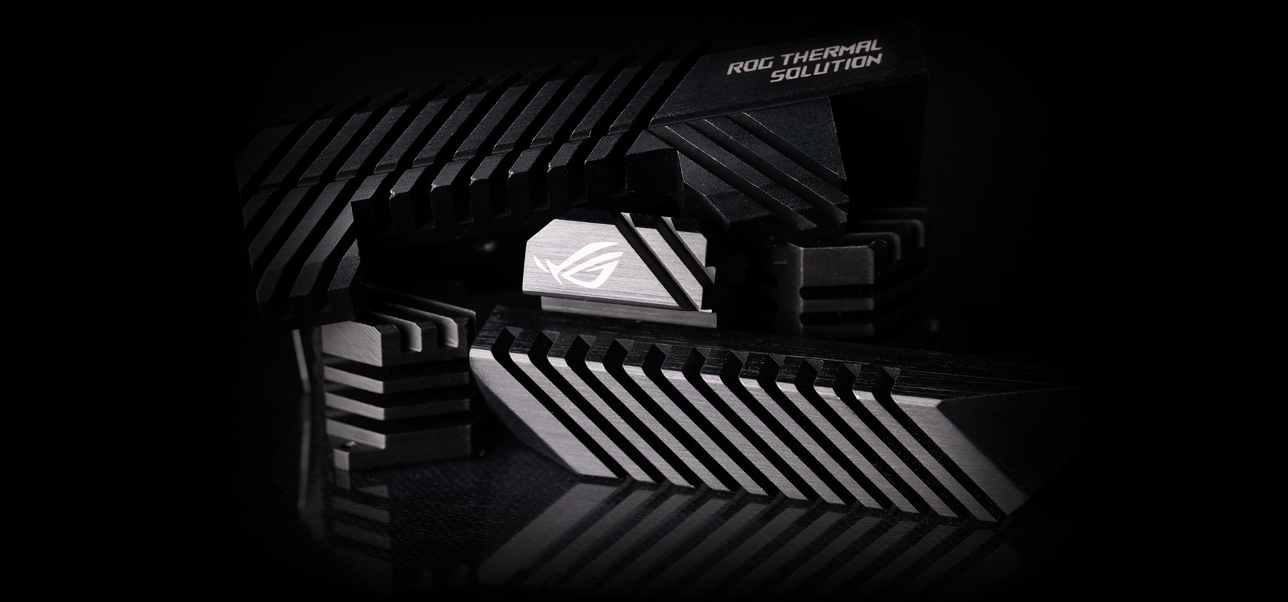 ROG heatsinks have 2x more volume than traditional designs, facilitating lower temperatures, longer component lifespan, and extended 0dB operation.