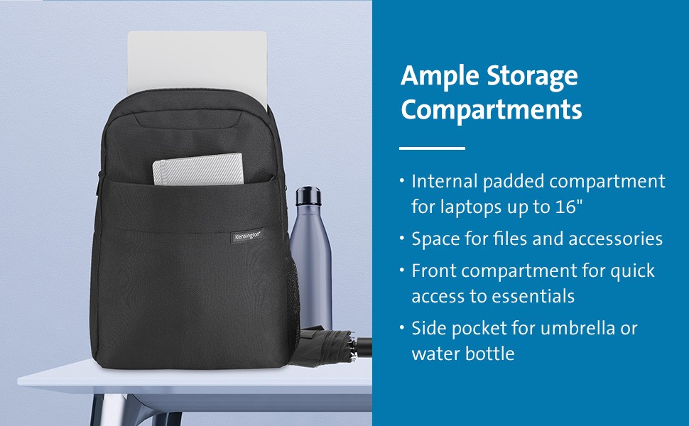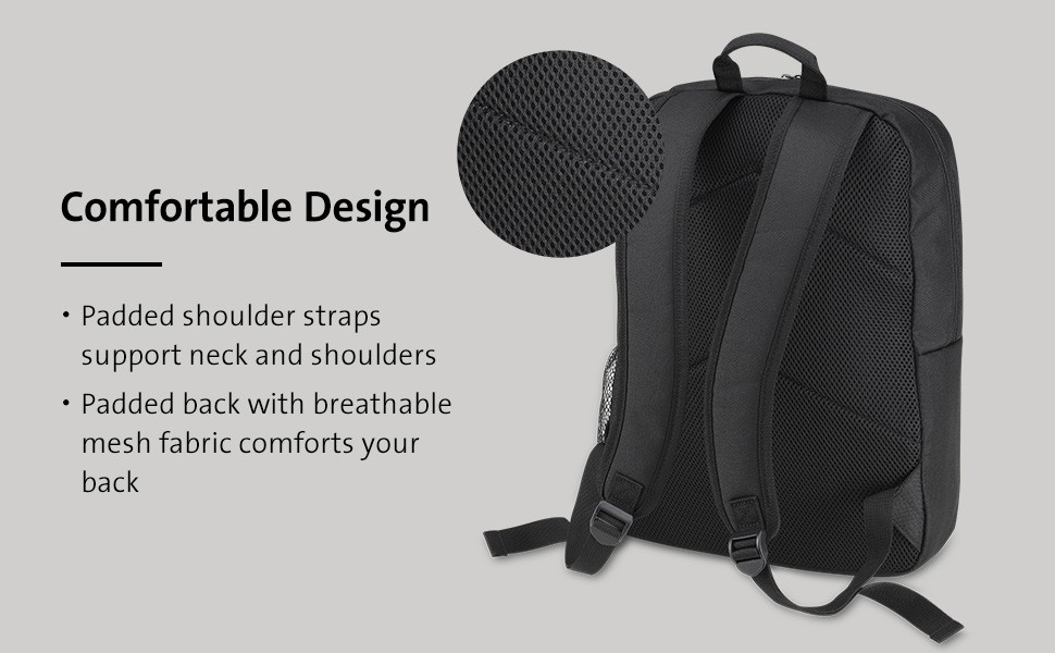 Modern, lightweight, and comfortable, the Simply Portable Lite Backpack fits laptops up to 16” in size. The compact design includes a padded compartment for the laptop, a zippered front compartment for easy access, and side a pocket for an umbrella or water bottle. Padded shoulder straps offer support for your neck and shoulders, and a padded back with breathable mesh fabric provides more comfort for your back.