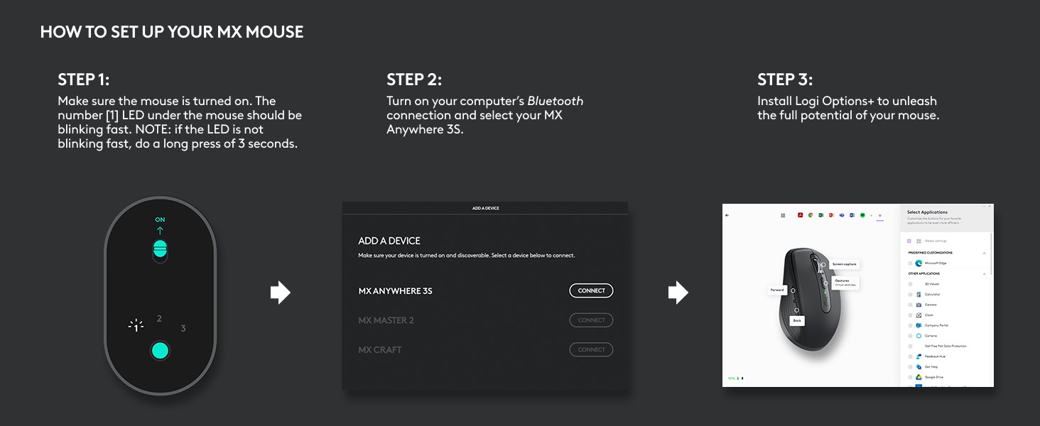 Customize buttons, set tracking speed, and use ready-made app-specific customizations to optimize your workflow with Logi Options+.