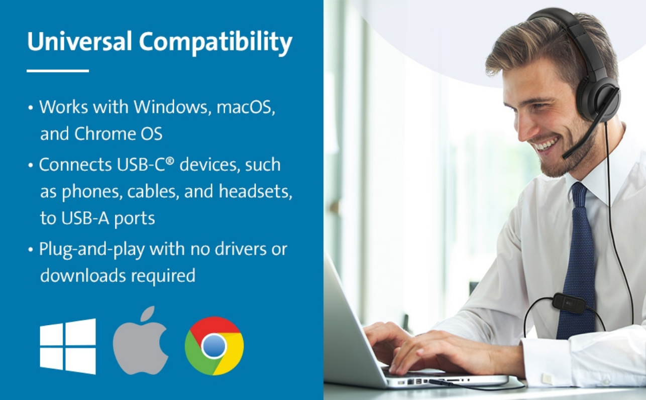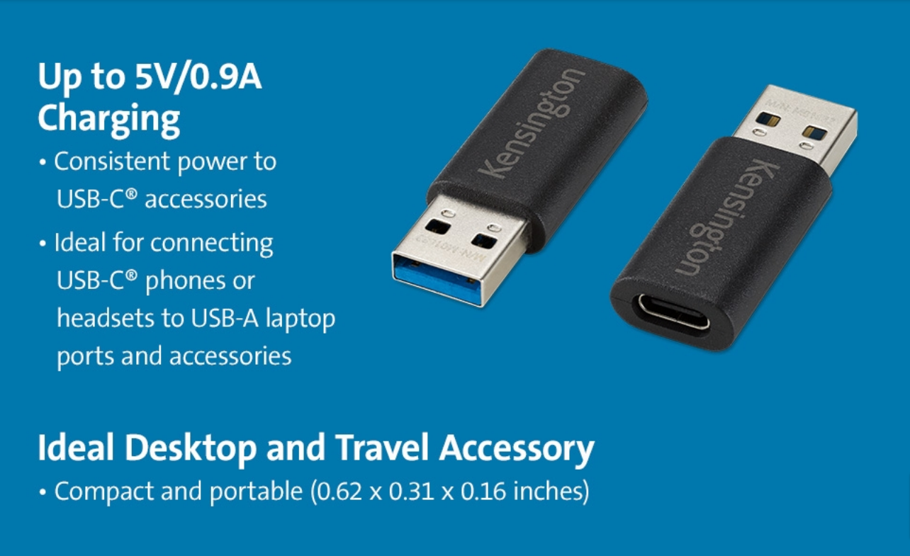 For professionals struggling to find enough USB-C® ports to connect their latest USB-C® accessories, the CA1020 USB-A to USB-C® M/F Adapter is an ideal solution. Allowing newer USB-C® accessories, such as phones, cables, headsets, hard drives and more, to be connected to a USB-A port on a laptop, docking station, or charger, the CA1020 USB-A to USB-C® M/F Adapter provides up to 10Gbps data transfer speeds and supports charging up to 5V/0.9A. Enhancing productivity with a simple plug-and-play solution, the CA1020 USB-A to USB-C® M/F Adapter is a convenient accessory for connecting USB-C® devices to USB-A ports.