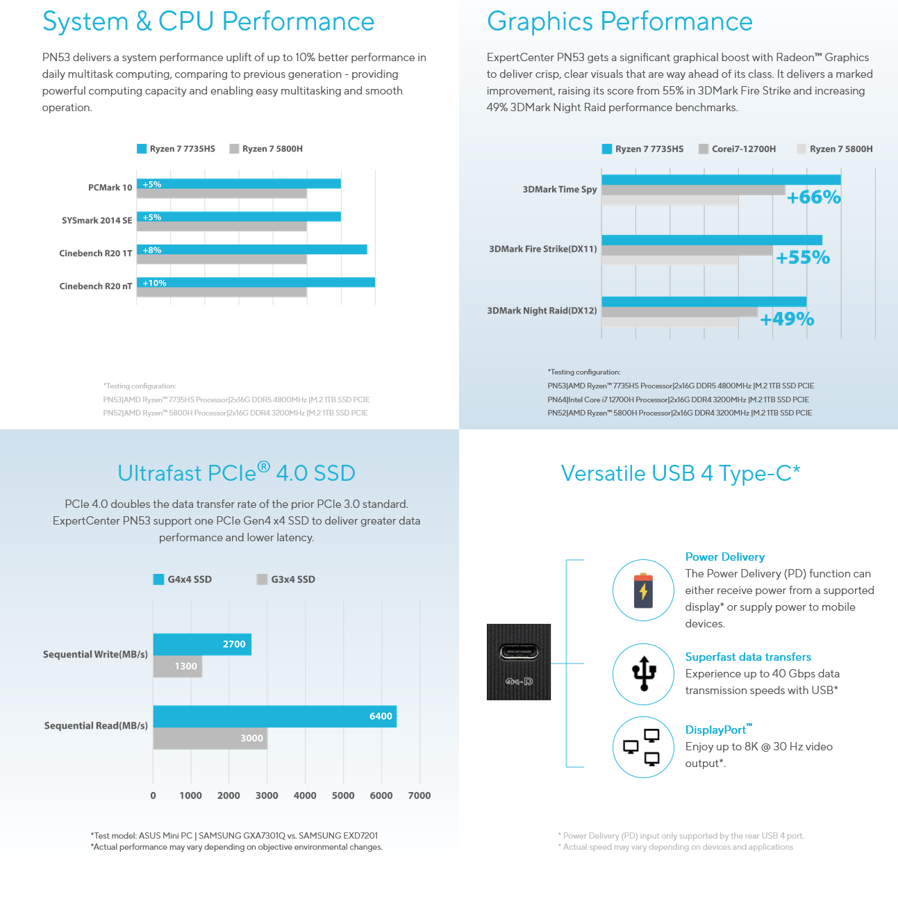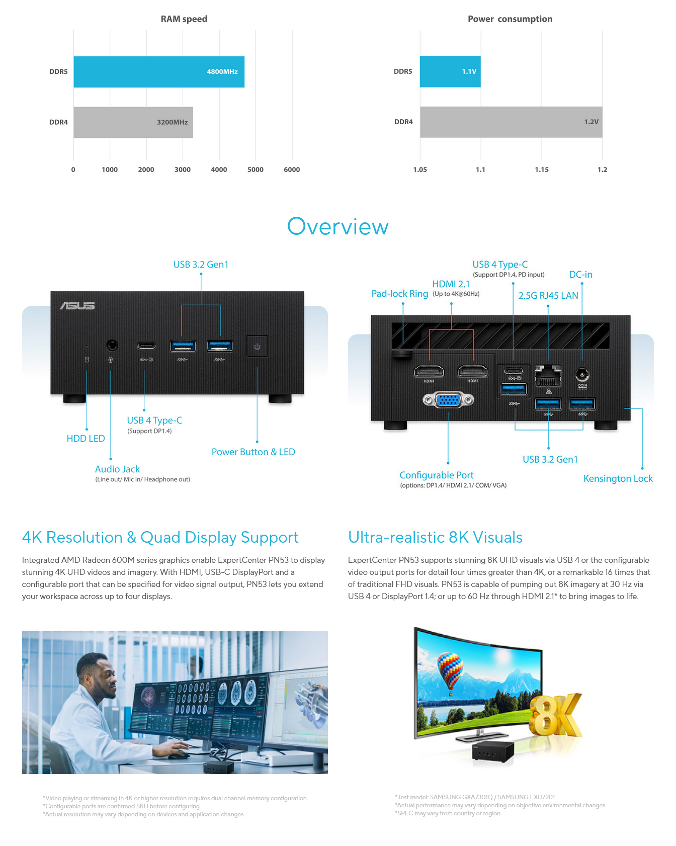 ASUS ExpertCenter PN53 is powered by the new AMD 6000 and 7000 Series CPU supporting the next gen memory - DDR5. With DDR5 4800MHz memory that is 1.5X faster and 8% more energy efficient than DDR4 3200MHz memory, PN53 provides excellent performance for daily computing tasks.