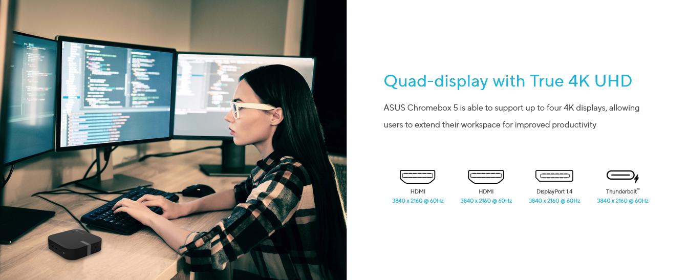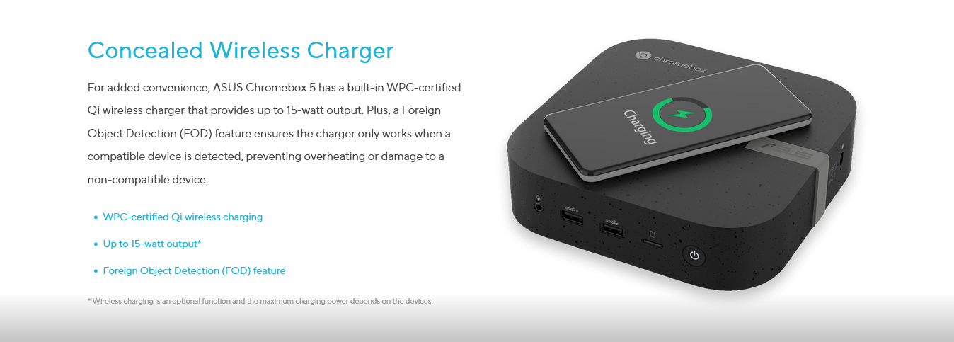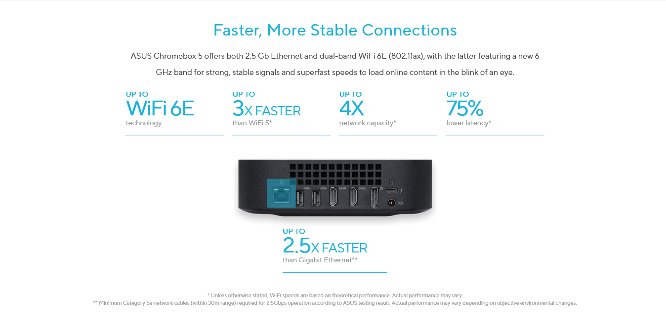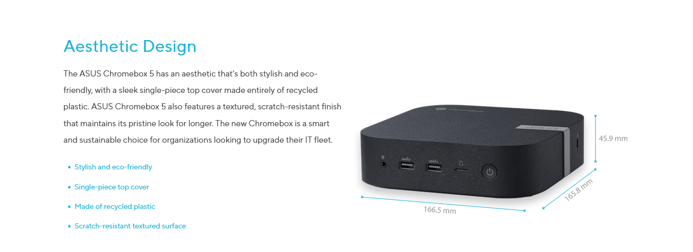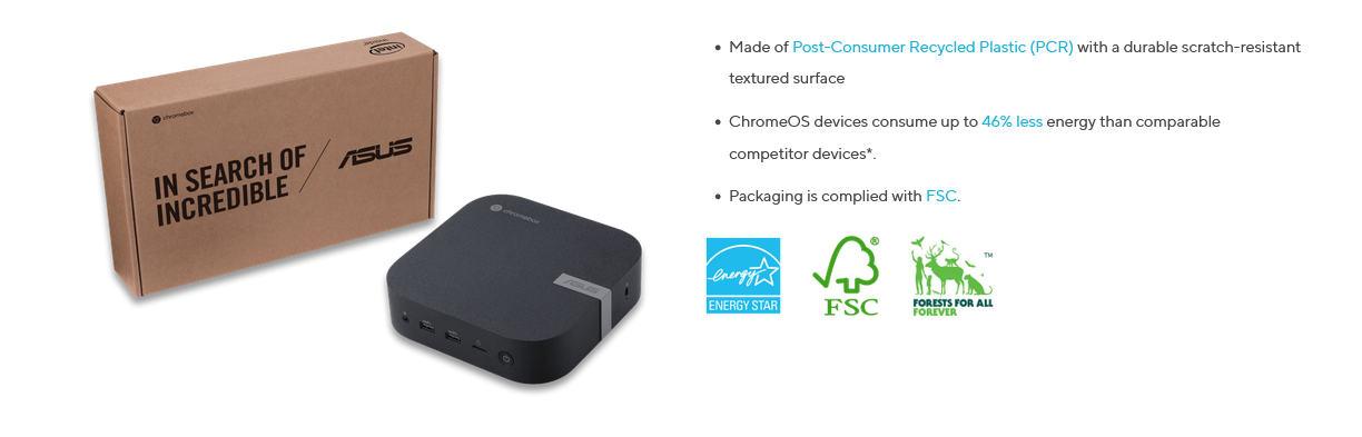 ASUS continues to make strides in its sustainability efforts. ASUS Chromebox 5 is made of post-consumer recycled plastics (PCR) with a durable scratch-resistant textured surface to ensure device longevity. In addition, ChromeOS devices such as ASUS Chromebox 5 are designed to consume up to 46% less energy than comparable competitor devices. As an added bonus, each ASUS Chromebox 5 is packed in FSC-certified packaging.