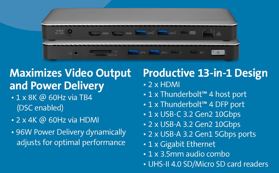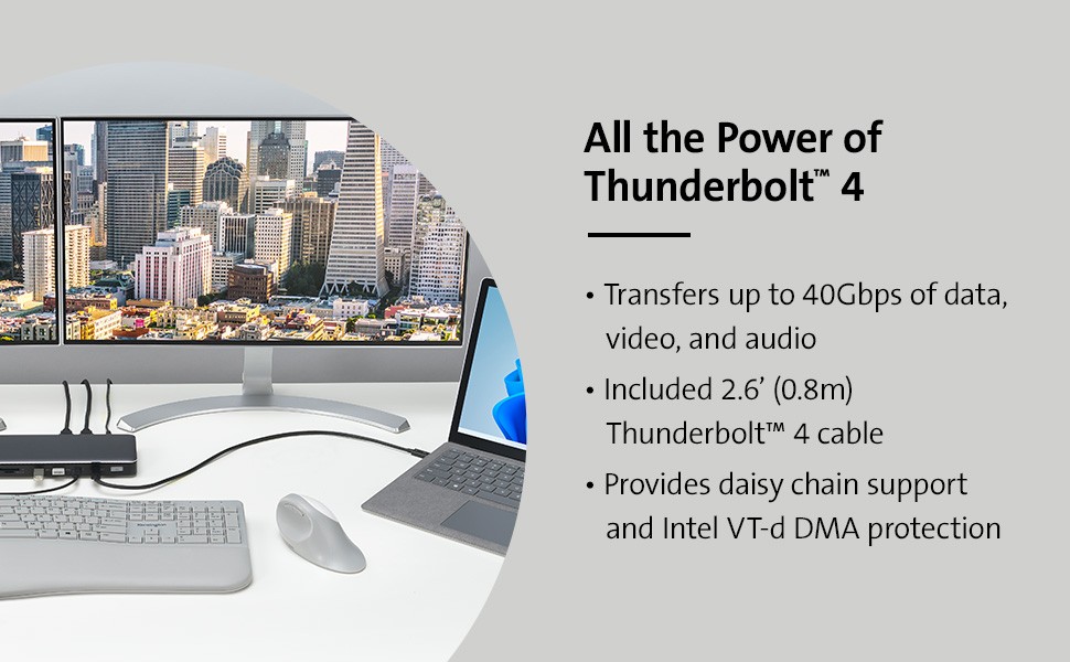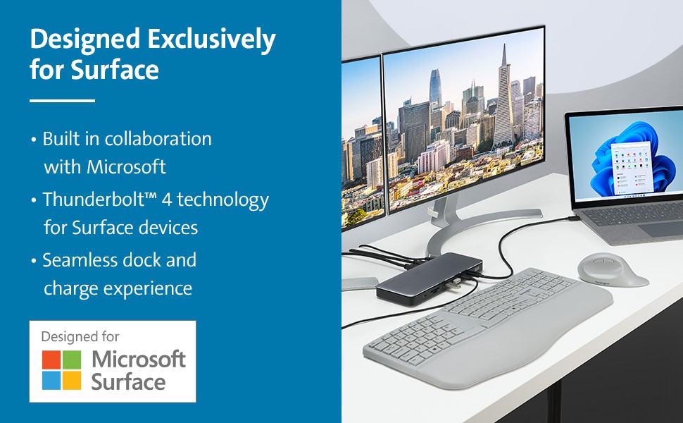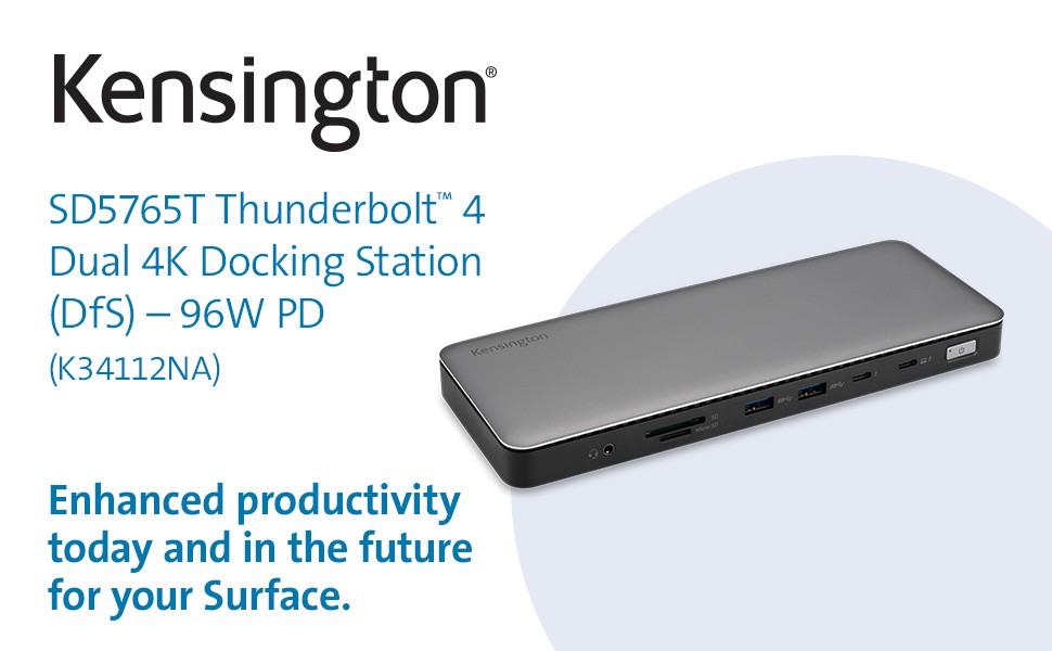 Designed exclusively for Surface, the SD5765T Thunderbolt 4 Dual 4K Docking Station provides more speed, more power, and more video options. Delivering 40Gbps data transfer speeds, support for Single 8K or Dual 4K @ 60Hz, two HDMI ports, multiple USB-C and USB-A ports, up to 96W of dynamic Power Delivery, and daisy chaining via Thunderbolt 4, the SD5765T provides a true plug-and- play experience and a tidier desktop—so you can be more productive and focused.