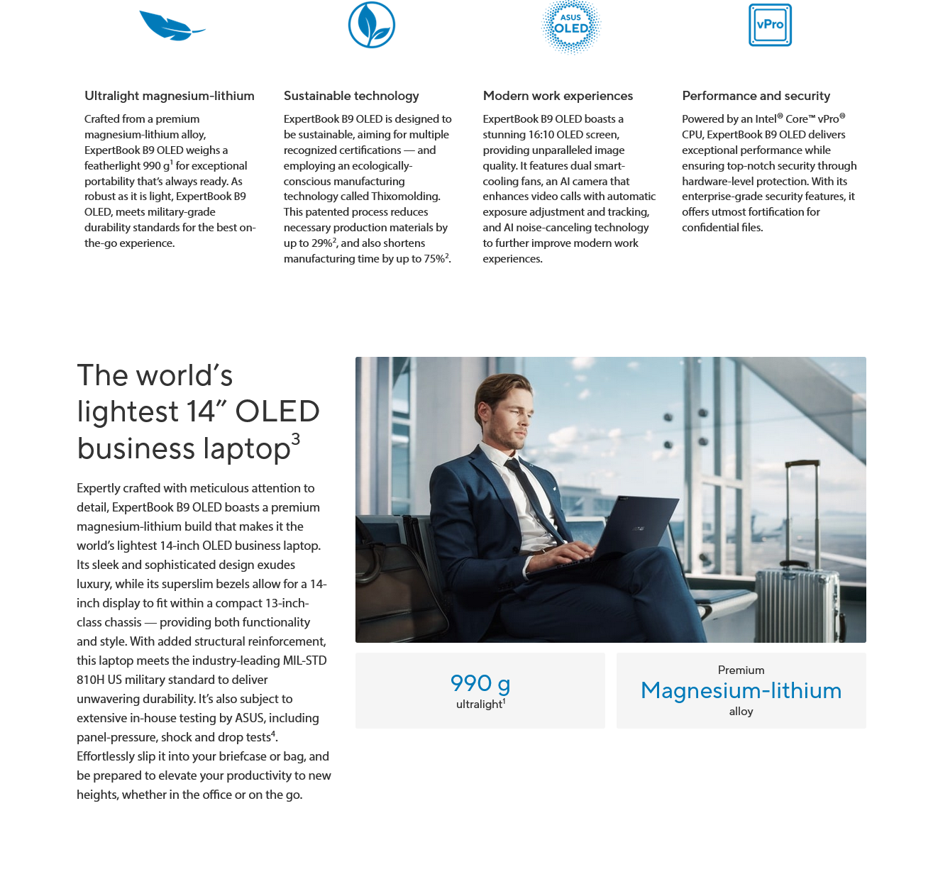 processor and a multitude of enterprise-grade security features, ExpertBook B9 OLED is the perfect partner for executives and business travelers, upping both your green credentials and professionalism — and setting a new benchmark for elite business laptops.