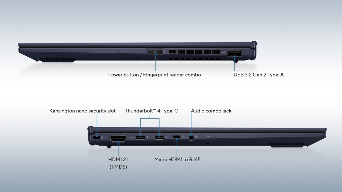 Despite its thin profile, ExpertBook B9 OLED is loaded with I/O ports. These include cutting-edge Thunderbolt
