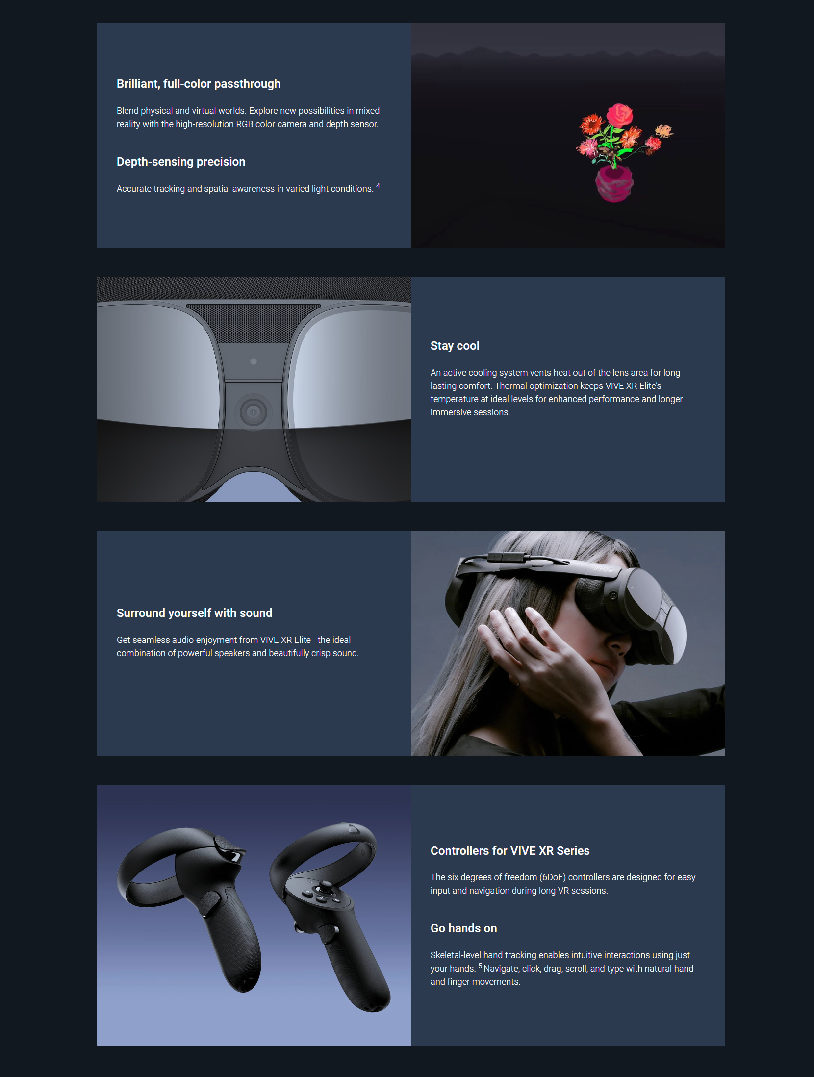 VIVE XR Elite features a brilliant, full-color passthrough camera and depth sensor that enable you to interact with virtual objects in your real-world space. Open up new possibilities in mixed reality for productivity, training, and collaboration. 1