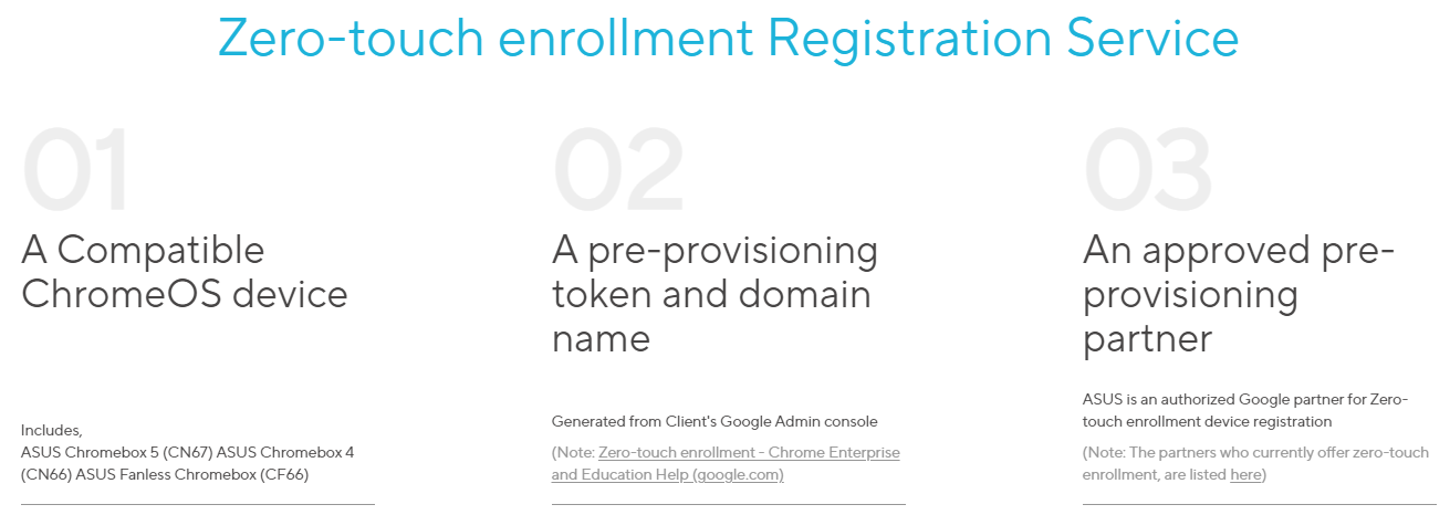 Zero-touch enrollment enables IT department to drop ship ASUS Chrome Enterprise devices that will automatically enroll into enterprise administration as soon as the end user connects to the internet.