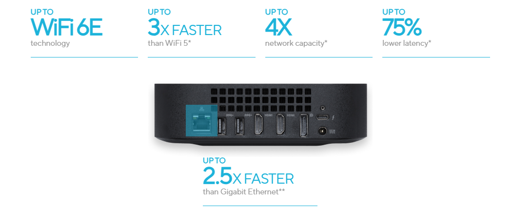 ASUS Chromebox 5 offers both 2.5 Gb Ethernet and dual-band WiFi 6E (802.11ax), with the latter featuring a new 6 GHz band for strong, stable signals and superfast speeds to load online content in the blink of an eye.