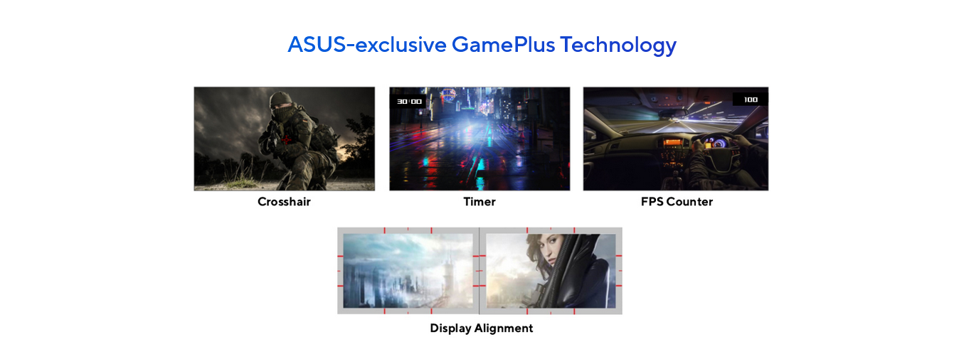 When it comes to design, ASUS always has customers in mind – ASUS exclusive GamePlus hotkey with Crosshair, Timer, FPS counter and Display Alignment functions to give you in-game enhancements that help you get more out of your game. This function is co-developed with input from pro gamers, allowing them to practice and improve their gaming skills.