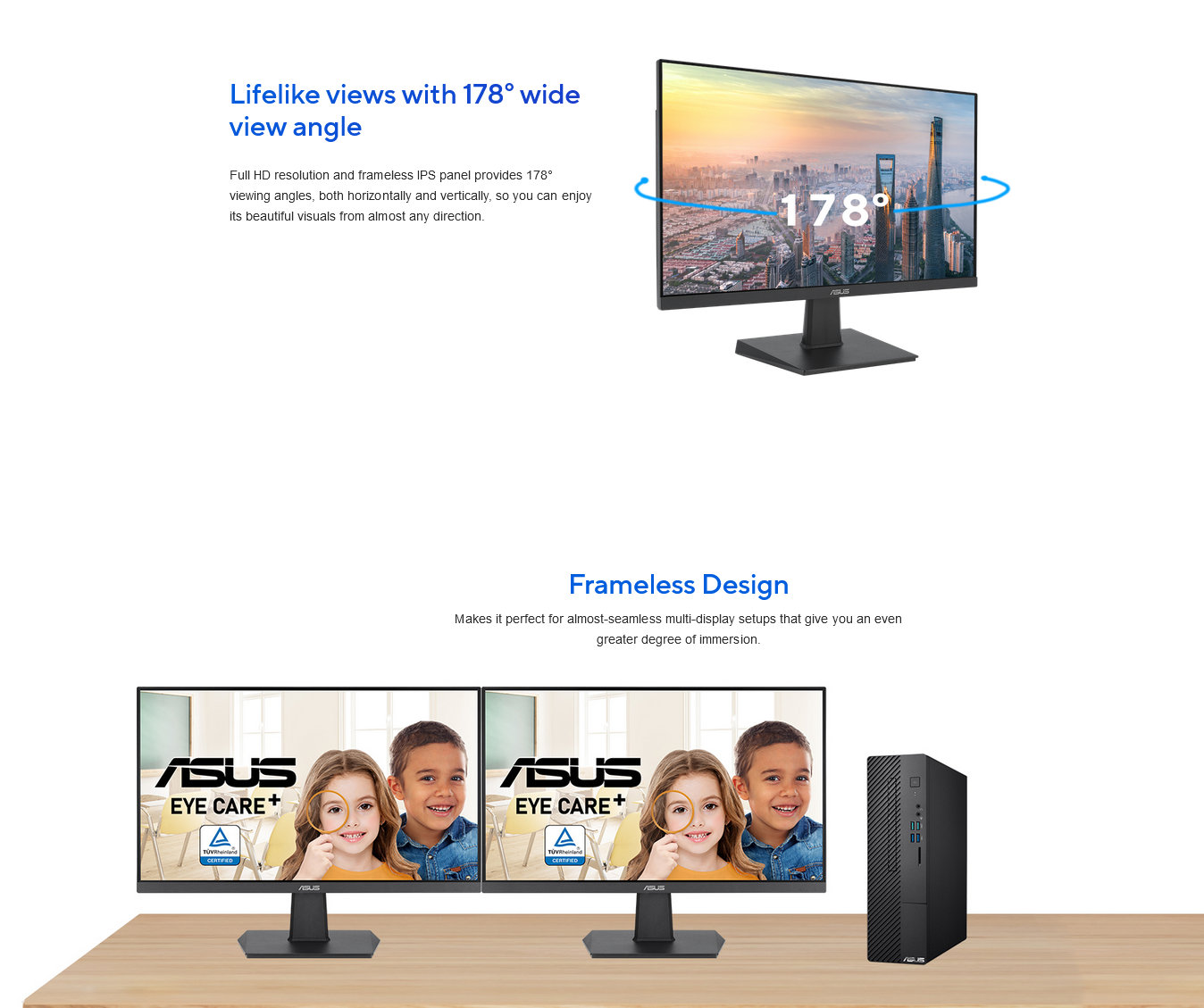 ASUS VA27EHF Eye Care Gaming Monitor features 27-inch IPS panel with Full HD (1920 x 1080) resolution, providing 178° wide viewing angle panel and vivid image quality. With fast 100Hz refresh rate and Adaptive-Sync technology to eliminate screen tearing and choppy frame rates for the smoother-than-ever experience. It also features TÜV Rheinland-certified Flicker-free and Low Blue Light technologies to ensure a comfortable viewing experience.