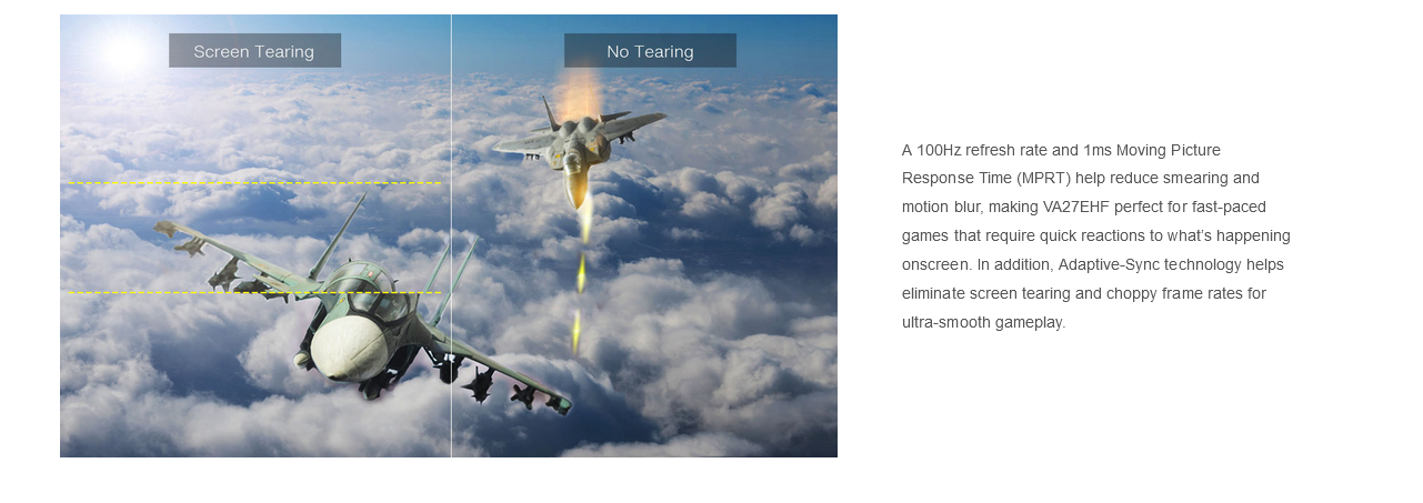 ASUS VA27EHF with fast 100Hz refresh rate and Adaptive-Sync technology to eliminate screen tearing and choppy frame rates. It refreshes content on the display 1.67-time faster than the one with a standard 60Hz refresh rate, giving you more fluid animation in video, casual gaming, and day-to-day work, can all benefit from the smoother-than-ever experience.