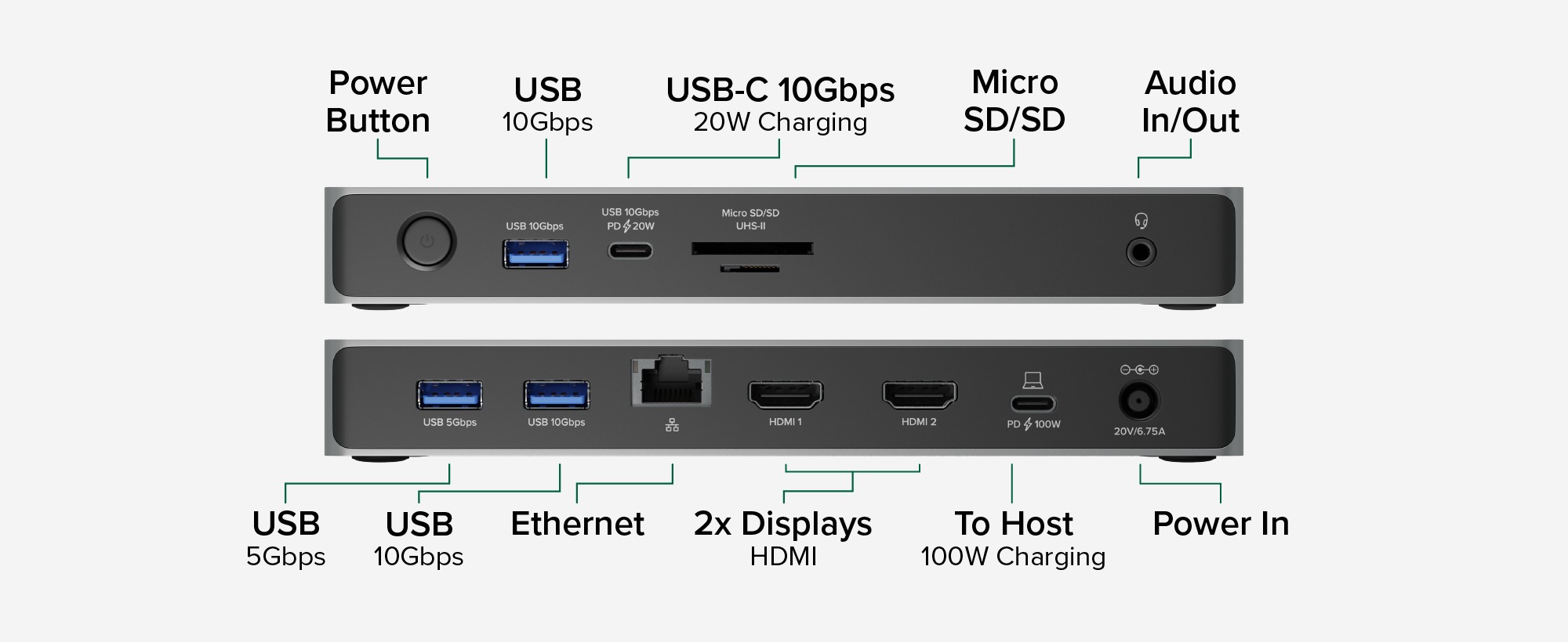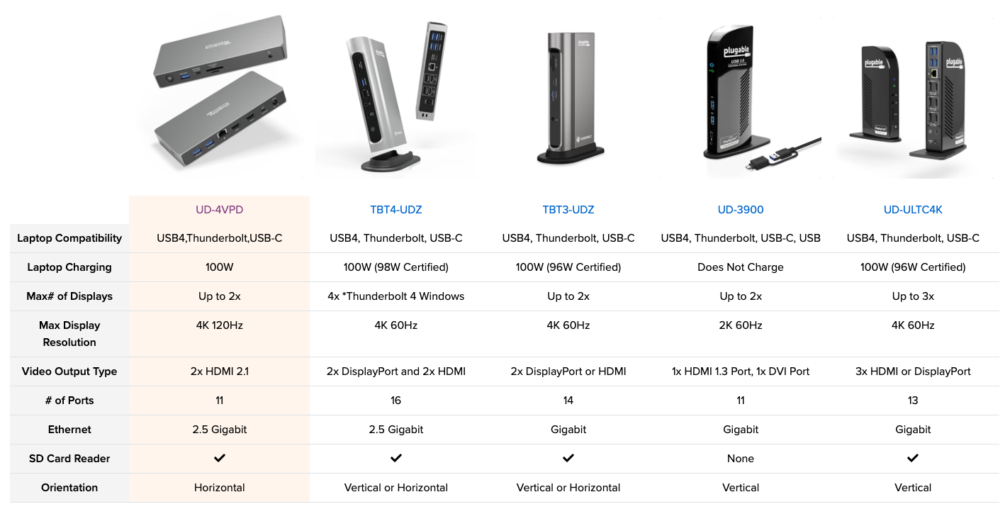 The full power of USB4 is on display in the Plugable 11-in-1 Dual Monitor Docking Station (UD-4VPD). Featuring two HDMI 2.1 ports that support up to 4K 120Hz, to provide crisp, smooth clarity across your HDMI monitor setup. If you really want to pack in the pixels, extend to 1x screen at 8K 60Hz. The UD-4VPD computer docking station doesn’t just bring you the best-in-class display options as a dual monitor adapter. It also resets the expectations of what a USB C dock should be capable of. And it does that with business-grade ports and specs. Native USB4 controller enables massive 40Gbps bandwidth for USB4 and Thunderbolt 4 systems. Connect your peripherals with 2x USB 10Gpbs ports, and 1x USB port 5Gbps. Connect to your network with a 2.5Gbps Ethernet port. Transfer data and images with SD and Micro SD card readers. Take advantage of the USB-C port with 10Gbps data and 20W fast charging for phones and tablets. Perhaps the most helpful feature, this USB-C docking station provides up to 100W charging so you never have to crawl under your desk to find a plug. And it does all of this through a single USB4 cable (3.3’ (1m) USB4 cable included). |