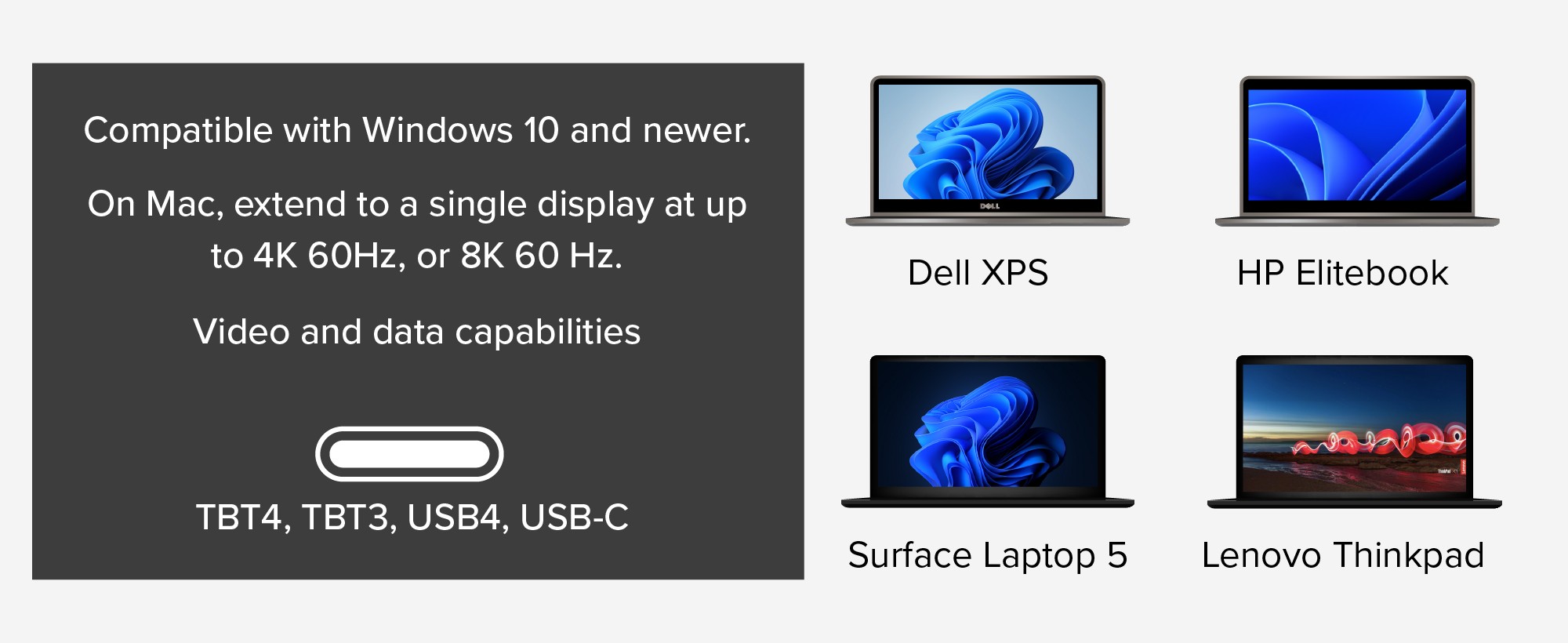 On Mac, extend to a single display at up to 4K 60Hz, or 8K 60 Hz.