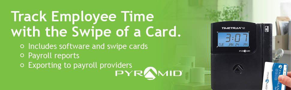 Simplify and automate employee time and attendance processing with the TTEZ Swipe Card System from Pyramid. Uses magstripe swipe cards to instantly register and record employee punches. Includes TimeTrax time and attendance software and 50 swipe cards. Edit employee time cards and run reports, including Payroll, Time Card, Attendance, Punch, Detailed Payroll, Card, Card Comprehensive, Employee Card, Employee Contact and Employee Seniority Reports. Creates export files for most major payroll providers. Simple to set up and easy to expand with employee upgrade packages and/or TTEZET add-on time clock terminals.