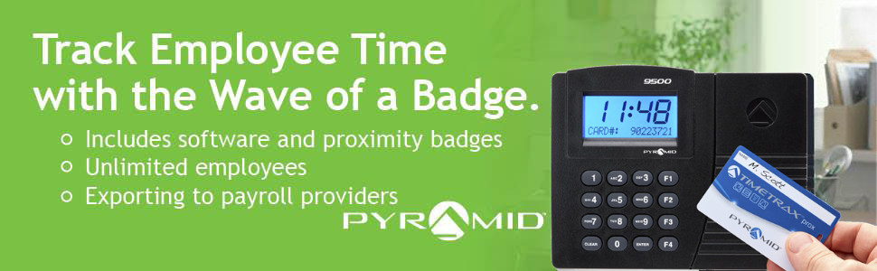 Simplify and automate employee time and attendance processing with the TTPROXEK Elite Proximity Time Clock System from Pyramid. A time clock terminal reads RFID proximity badges to instantly register and record employee punches.