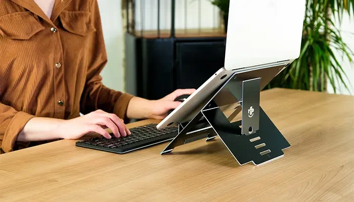 This laptop stand is easily adjustable in 5 different heights. This way, you always work at eye level and prevent a hunched posture and neck and back complaints. Very comfortable to use in the office, at home or on the road. It places your head in a natural position and reduces tension in your neck and shoulder muscles.