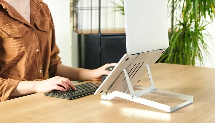 The R-Go Riser Basic laptop stand is the thinnest laptop stand at 1.2 mm. The stand is easily height adjustable in 3 positions, so you can always work at eye level. This way the head is in a natural position and reduces tension in your neck and shoulder muscles.
